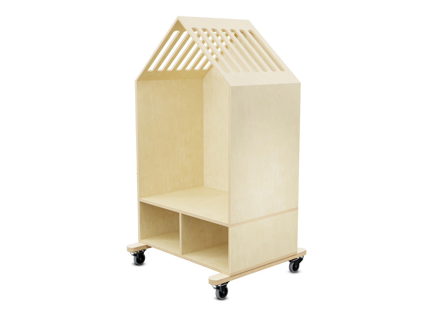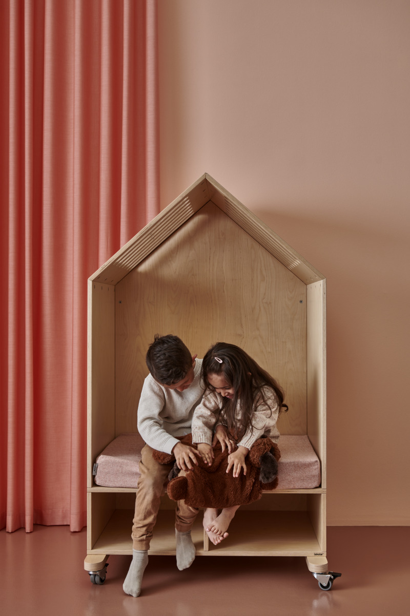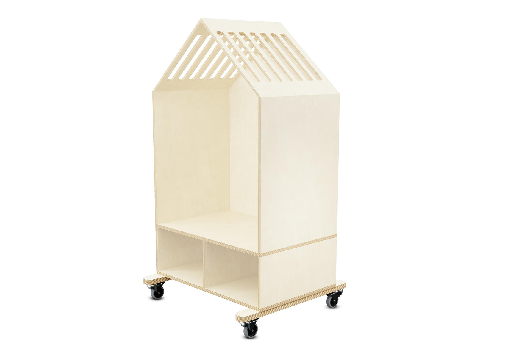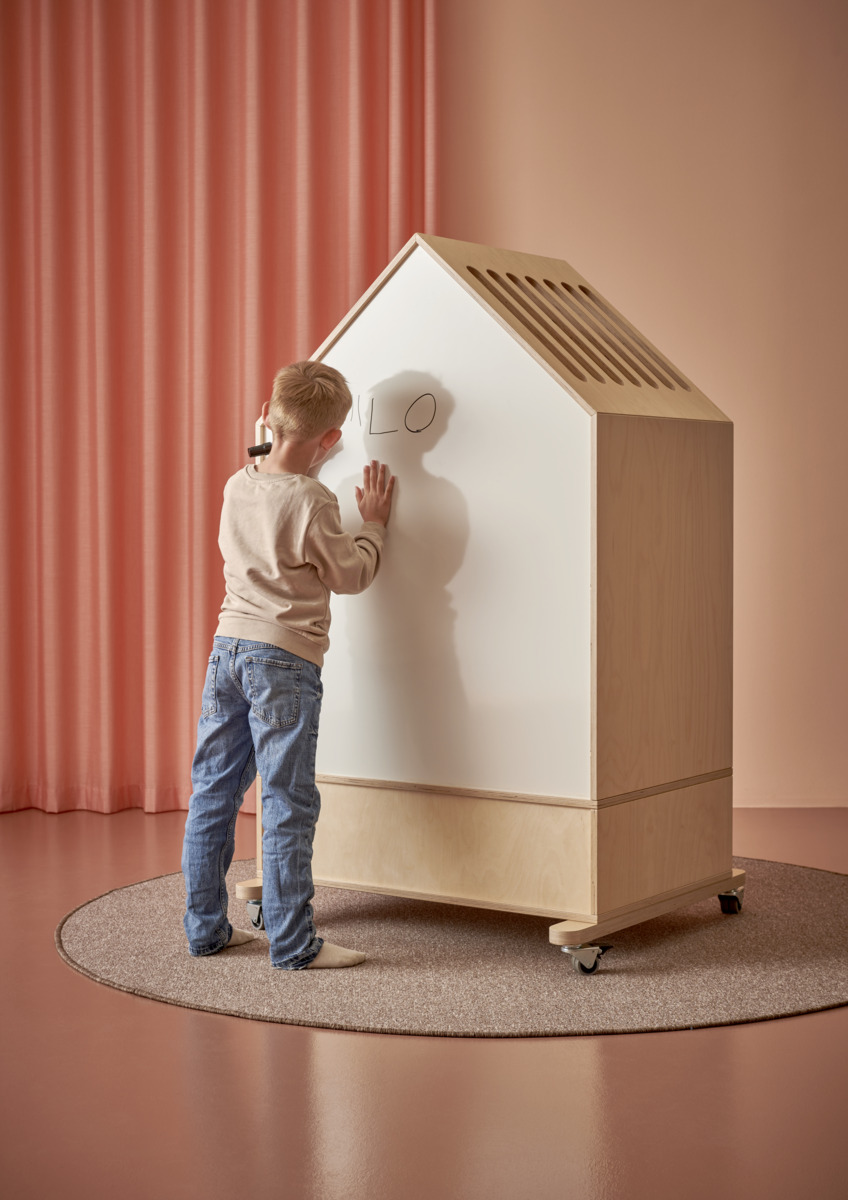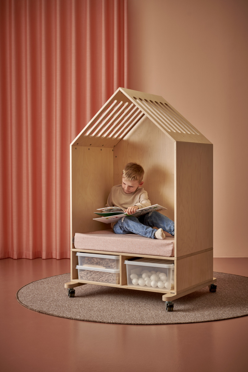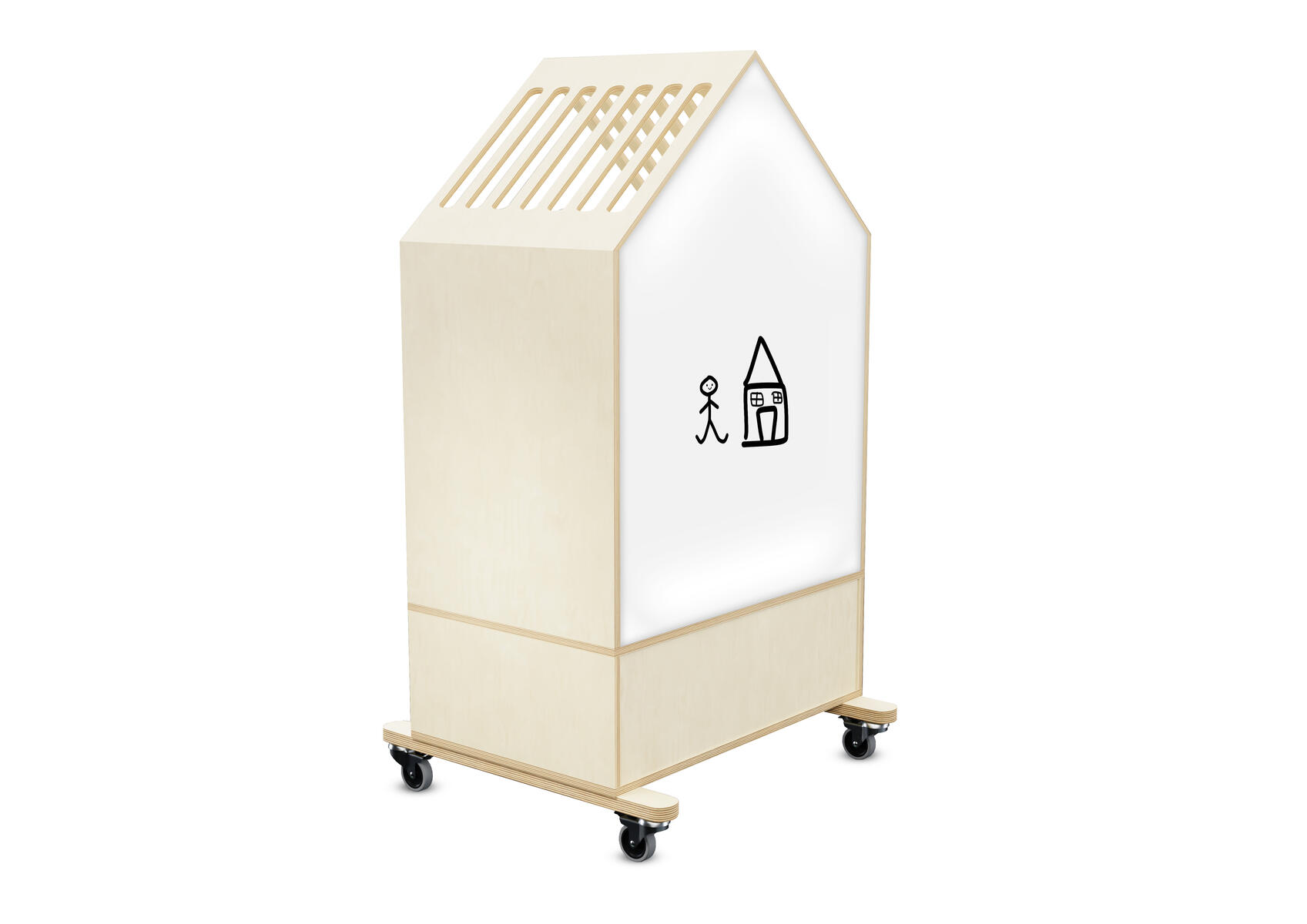 Färdigbyggt hus med smart förvaring och stödben. Hjul med broms. Plywood med högtryckslaminat. Björk och vitpigmenterad helt i plywood. Baksida med magnetisk whiteboard. Kombinera gärna med Fixamadrass 3 djup 58 cm.