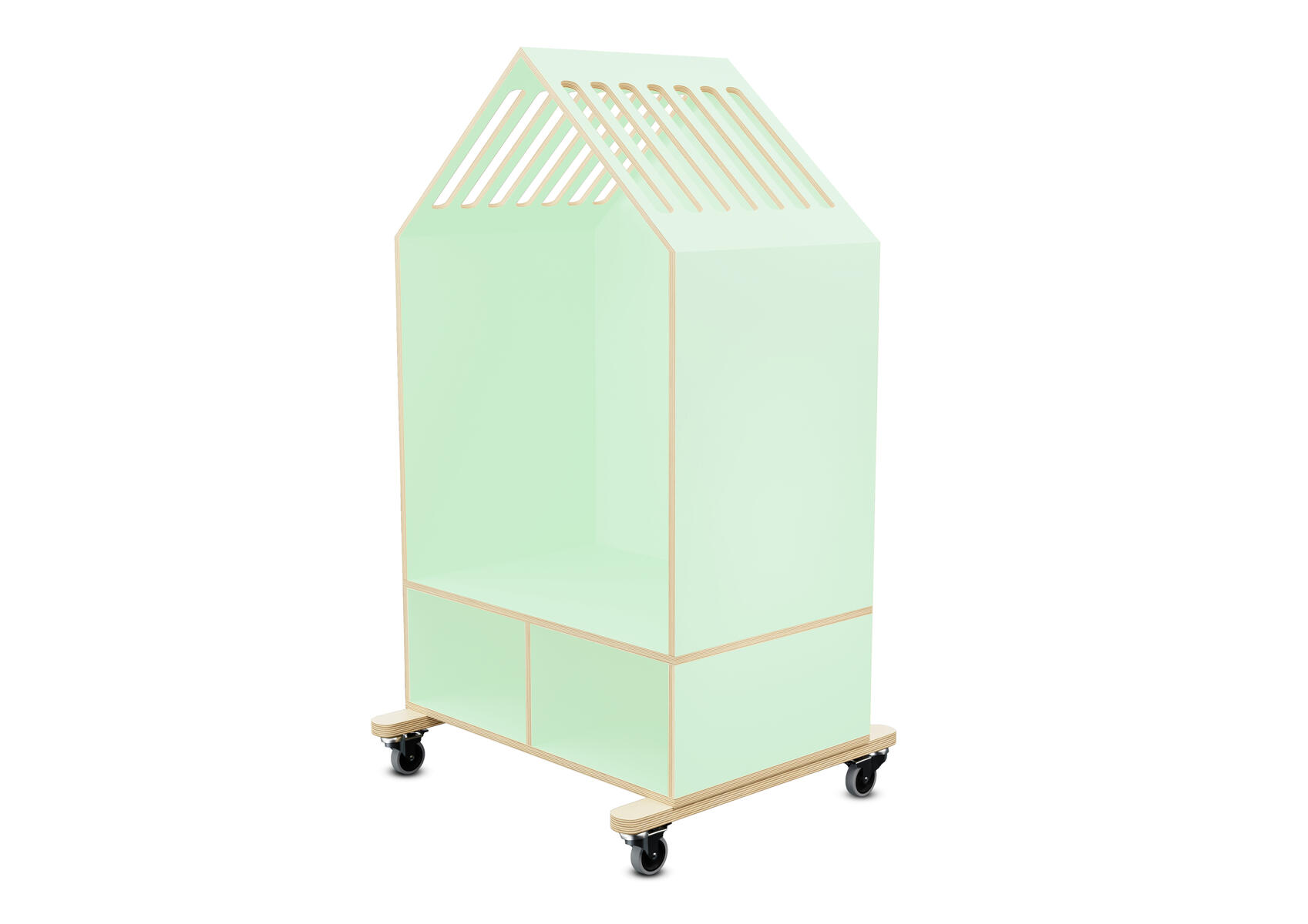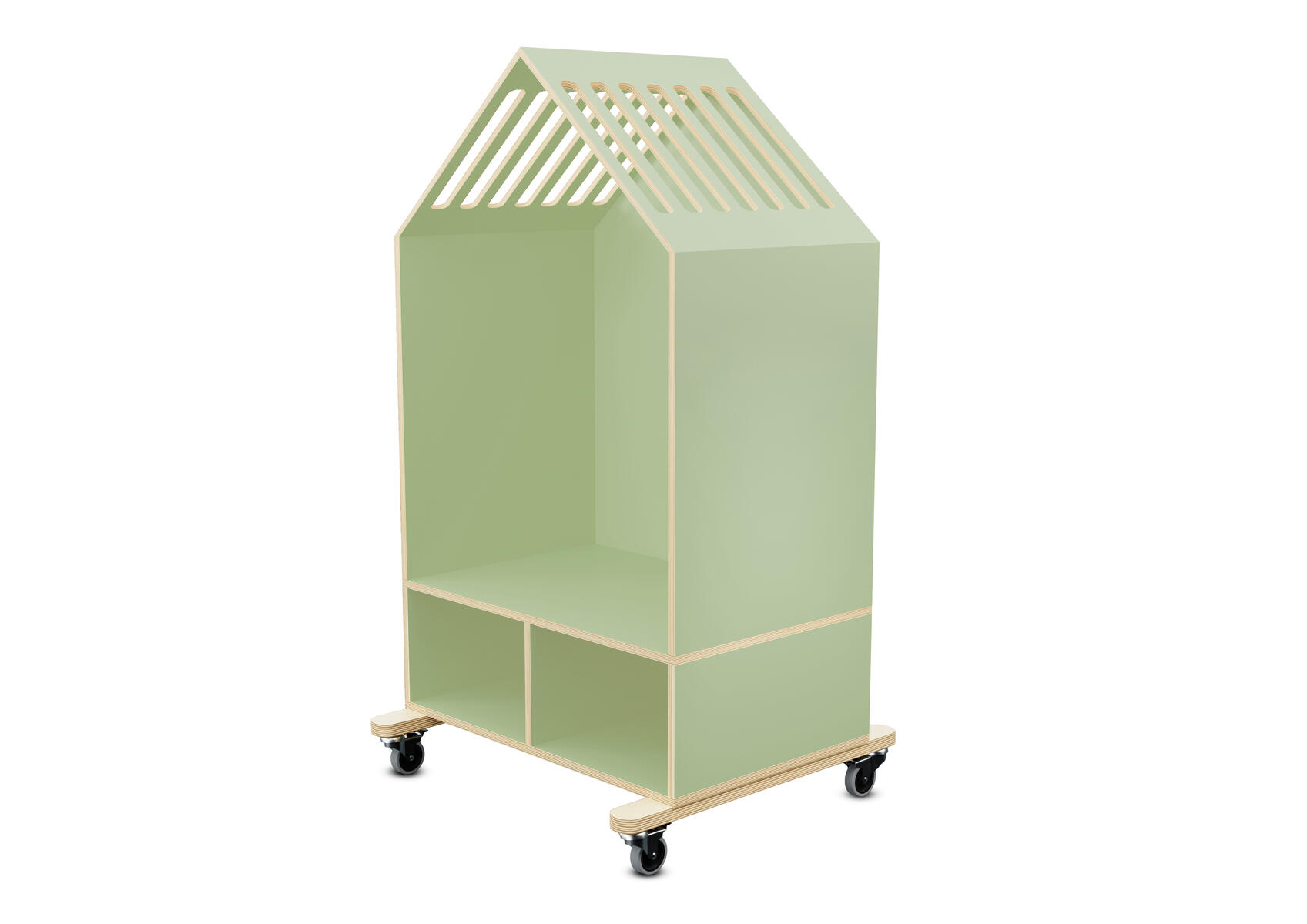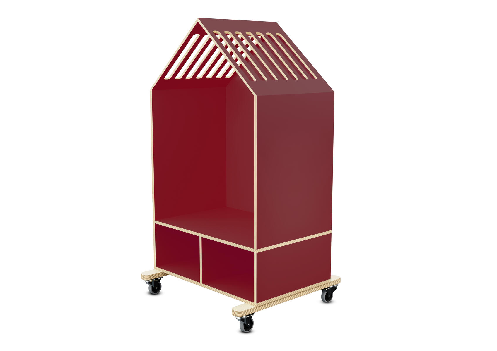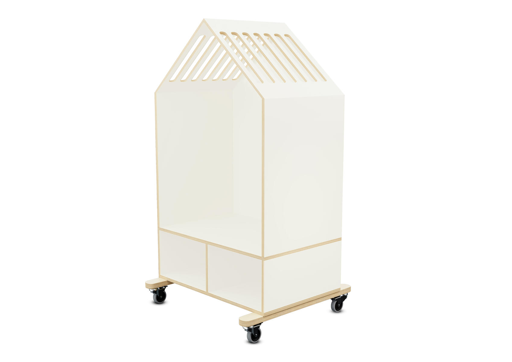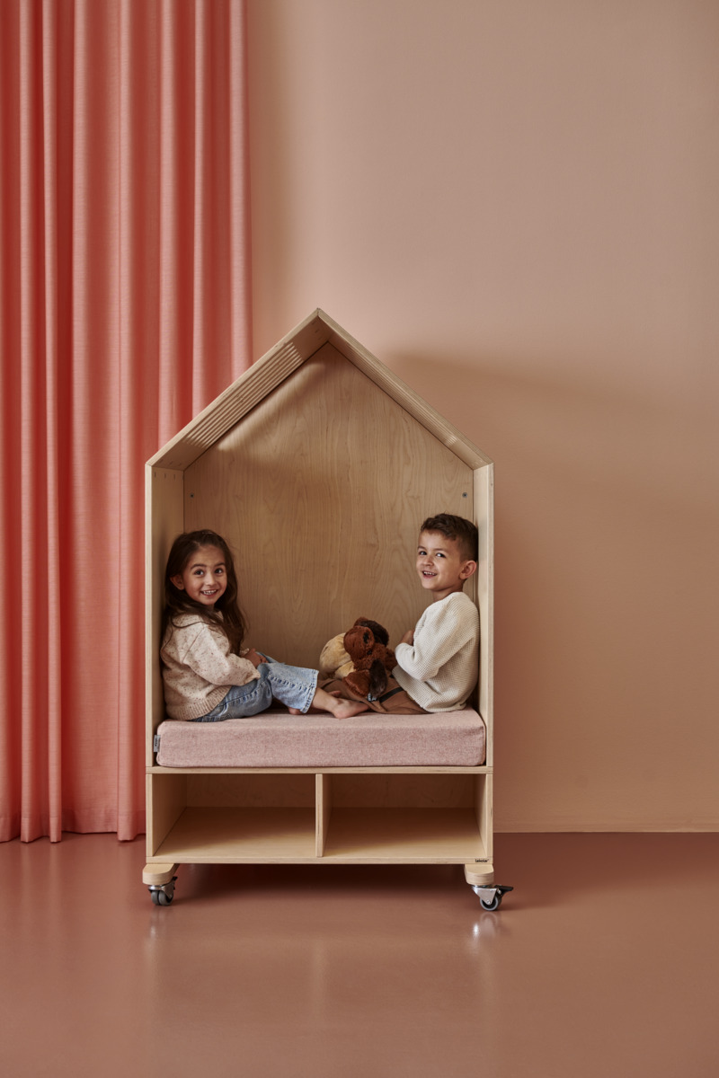 Färdigbyggt hus med smart förvaring och stödben. Hjul med broms. Plywood med högtryckslaminat. Björk och vitpigmenterad helt i plywood. Baksida med magnetisk whiteboard. Kombinera gärna med Fixamadrass 3 djup 58 cm.