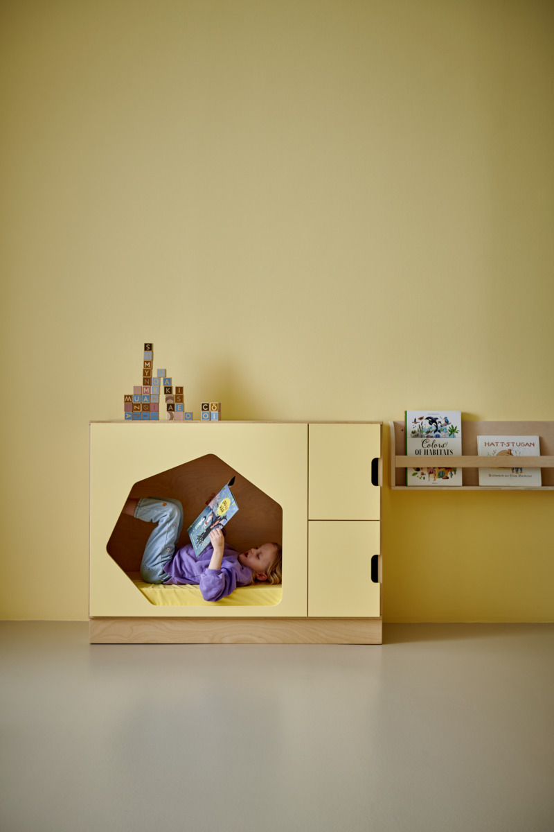 Fixa färdigmodul gjord som ett krypin i form av en grotta. Stomme tillverkad i björkplywood med front av målad 15 mm MDF. För att undvika tipprisk ska fristående moduler ha stödben med 2 låsbara hjul. Moduler med ben eller sockel ska fästas mot vägg, gäller moduler högre än 80 cm. Kombinera gärna med Fixamadrasser. I satsen ingår bas 38426-609, hylla 38242-609, front 117282 och 2 dörrar 38492. Svanenmärkt, licensnummer 5031 0099.