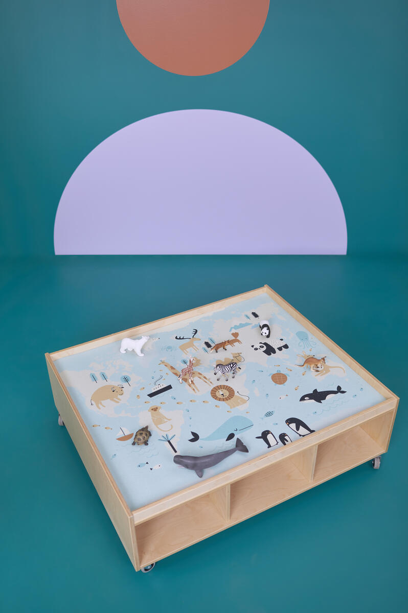 Ett rejält och mycket funktionellt lekbord med låsbara hjul. På lekbordet kan barnen bygga med klossar, lekdjur, järnväg m.m. Med 12 fack för smart förvaring, anpassade efter mått till förvaringsbox Classic. Alla Lekolars garage, bondgårdar och dockhus är anpassade för lekbordet. Fina lekmattor för att dämpa ljudet och skydda ytan finns att köpa till. Av kraftig, vitpigmenterad, FSC-godkänd plywood. Levereras färdigmonterat. Mått: L99xB84xH55 cm. Fackens innermått: B31xH20xD39 cm. Från 3 år.