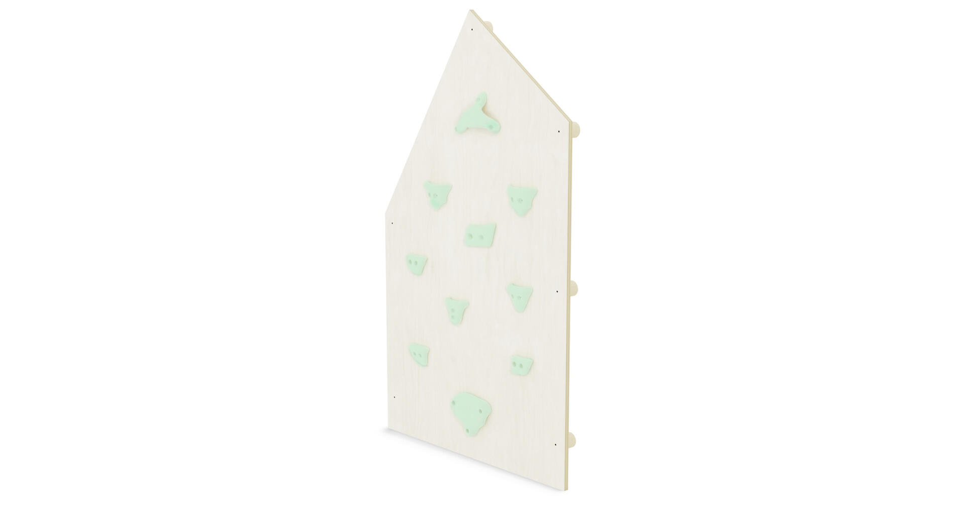 Motorikvägg som monteras direkt på väggen. Monteras flera väggar bredvid varandra är det viktigt att de monteras ihop för att minimera klämrisken. Används alltid med godkänt fallunderlag enligt EN1177. Fallutrymme 1,5 m runtom. Väggen är försedd med klättergrepp. Med förborrade hål. Förborrade distanser medföljer för att det ska bli rätt avstånd från väggen. Björkplywood.