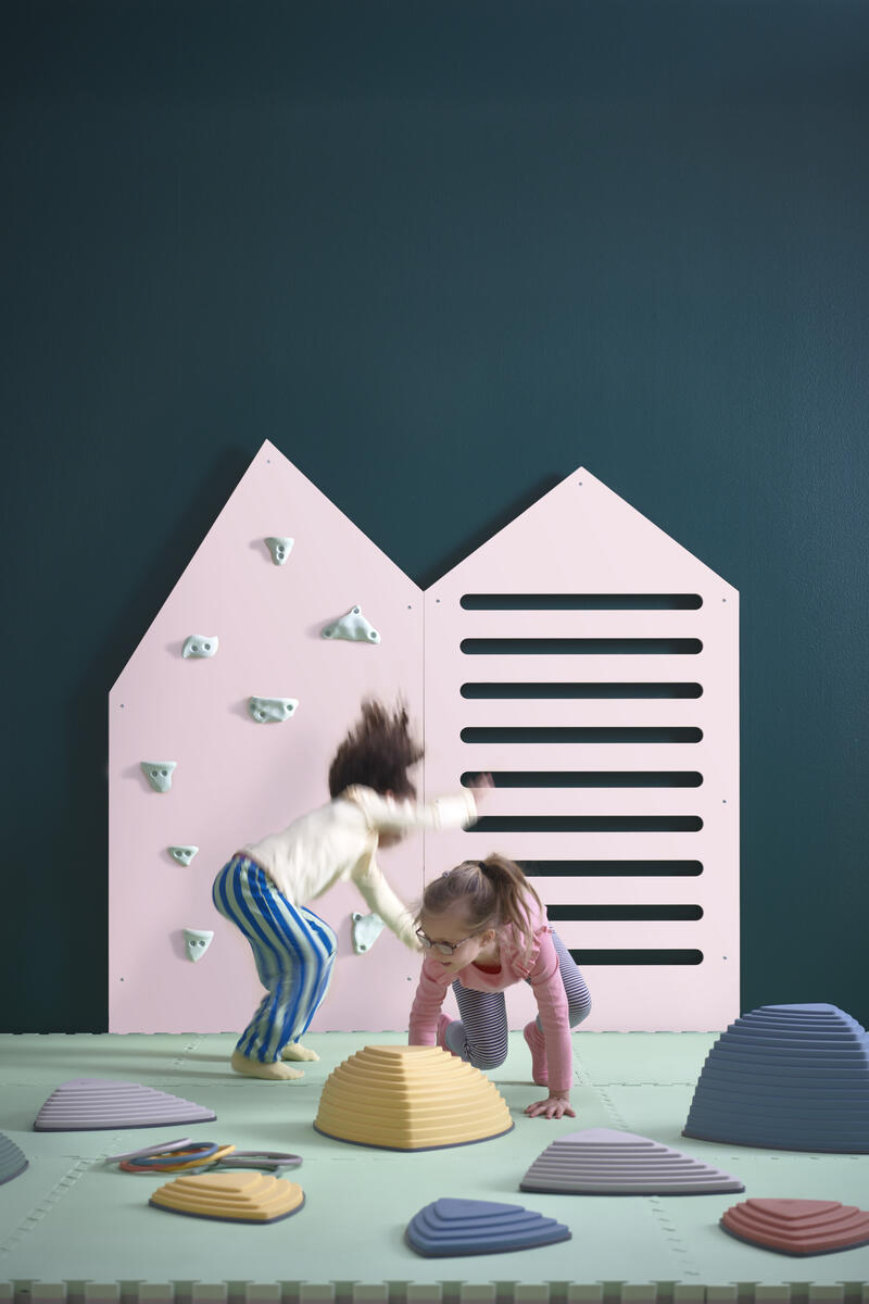 Motorikvägg som monteras direkt på väggen. Monteras flera väggar bredvid varandra är det viktigt att de monteras ihop för att minimera klämrisken. Används alltid med godkänt fallunderlag enligt EN1177. Fallutrymme 1,5 m runtom. Väggen är försedd med klättergrepp i flera olika pastellfärger. Med förborrade hål. Förborrade distanser medföljer för att det ska bli rätt avstånd från väggen. Björkplywood.