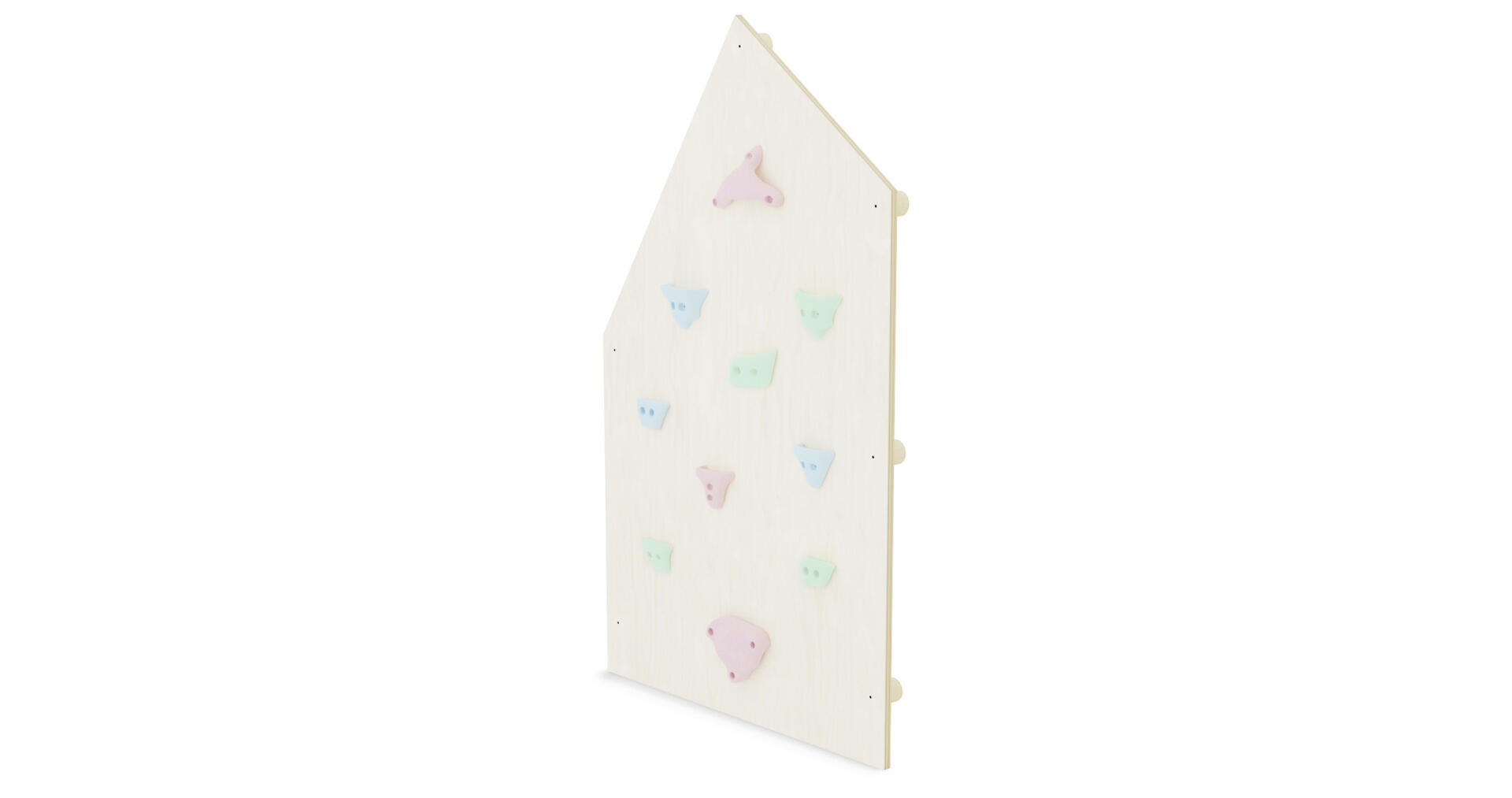 Motorikvägg som monteras direkt på väggen. Monteras flera väggar bredvid varandra är det viktigt att de monteras ihop för att minimera klämrisken. Används alltid med godkänt fallunderlag enligt EN1177, t.ex. artnr 124575. Fallutrymme 1,5 m runtom. Väggen är försedd med klättergrepp i flera olika pastellfärger. Med förborrade hål. Förborrade distanser medföljer för att det ska bli rätt avstånd från väggen. Björkplywood.