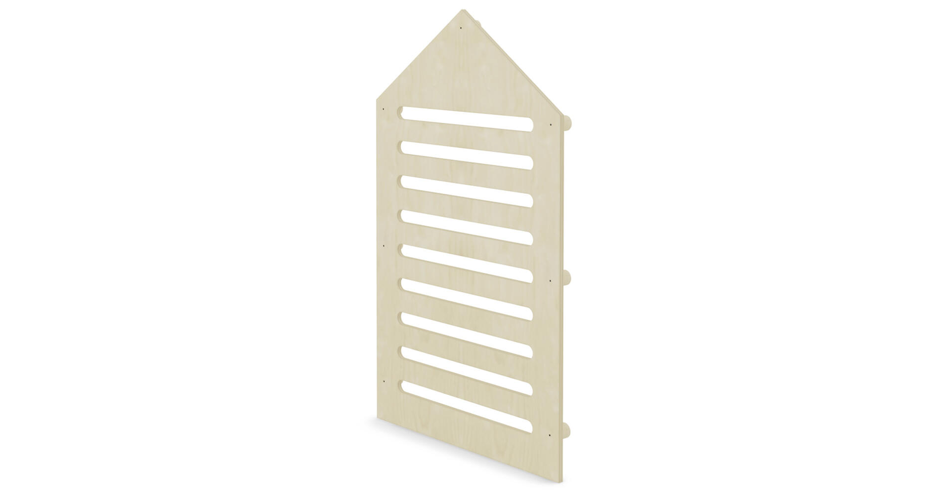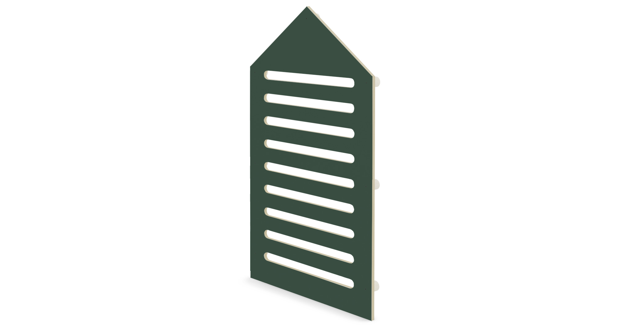 Motorikvägg i björkplywood utformad som en ribbstol. Förberedd med förborrade hål för säker och enkel montering. Monteras fler väggar bredvid varandra är det viktigt att de monteras ihop för att minimera klämrisken. Används alltid med godkänt fallunderlag enligt EN1177. Fallutrymme 1,5 m runtom. Förborrade distanser medföljer för att det ska bli rätt avstånd från väggen. Mellanrum ribba är 4,6 cm. Avstånden mellan ribborna är 11,5 cm. Björk och vitpigmenterad helt i plywood, övriga färger i laminat.