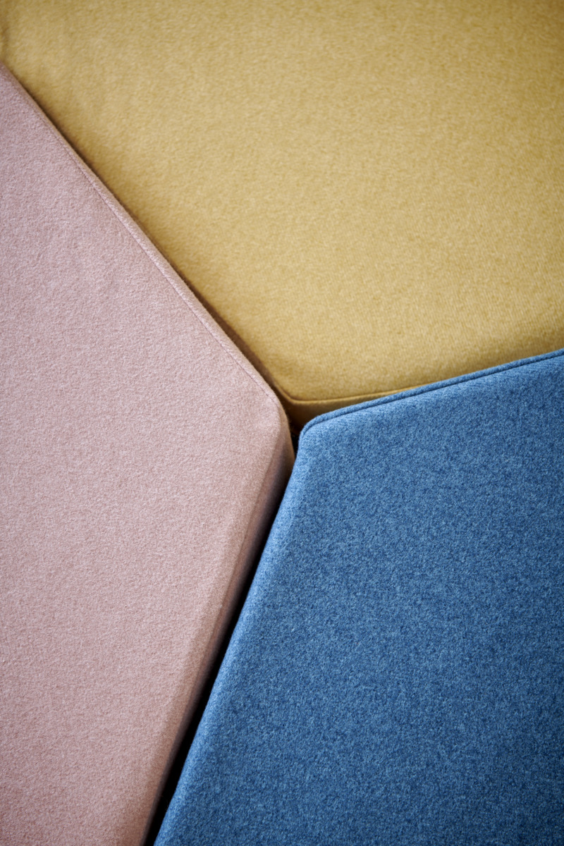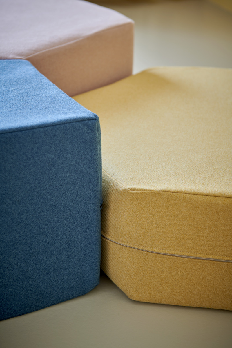 Mjukt podium med kallskumskärna. Fodral i tyg Slottsfjord, tillverkat av 100 % återvunnen polyester. Ett slitstarkt ulliknande polyestertyg med ett Skandinaviskt och robust uttryck, användbart i alla miljöer. Fodralet är avtagbart och tvättbart i 60 grader.