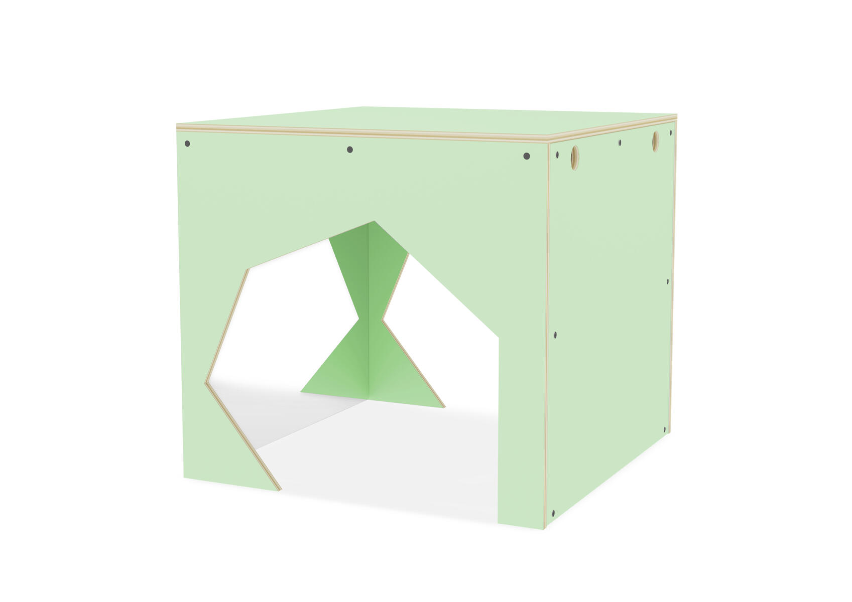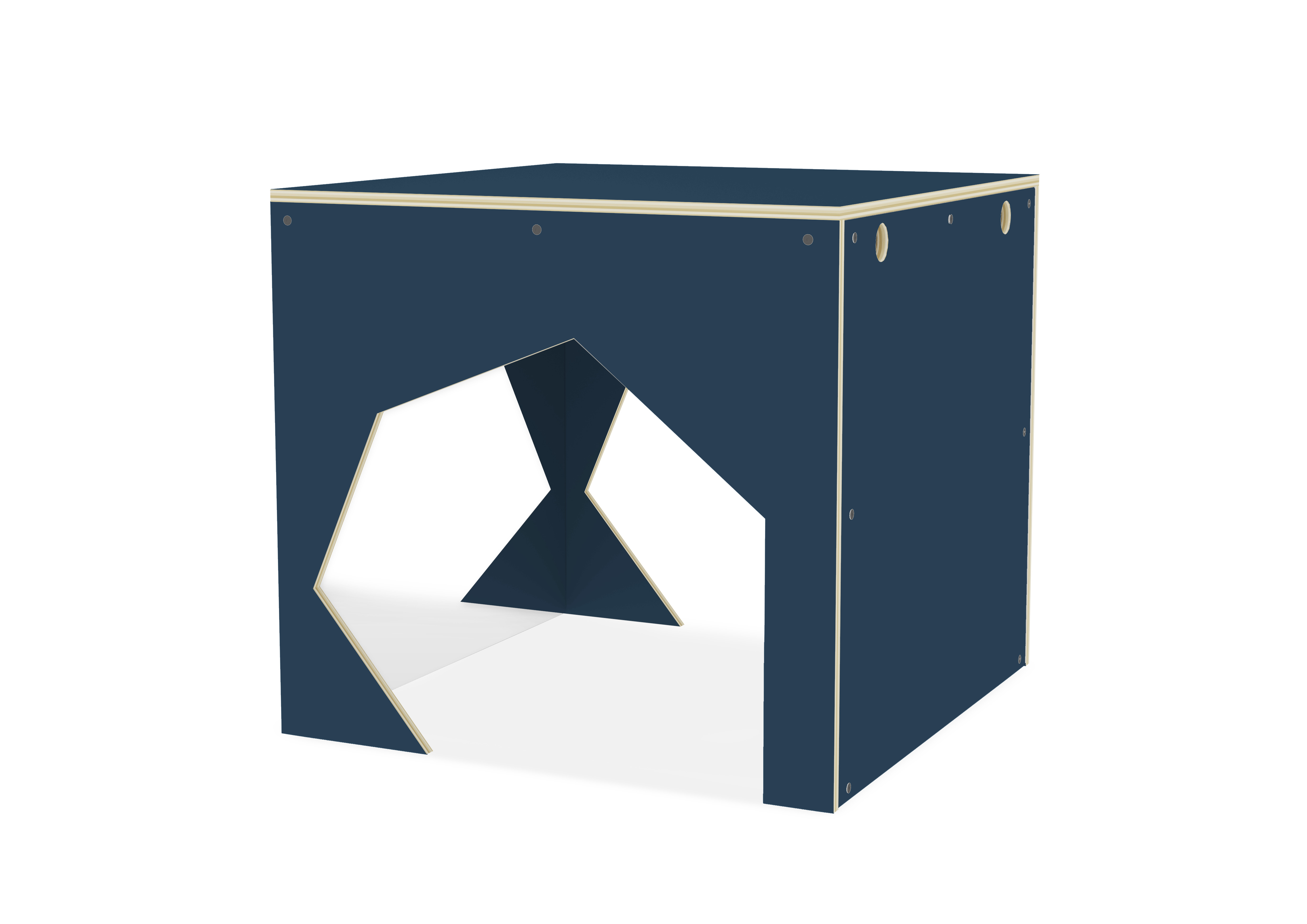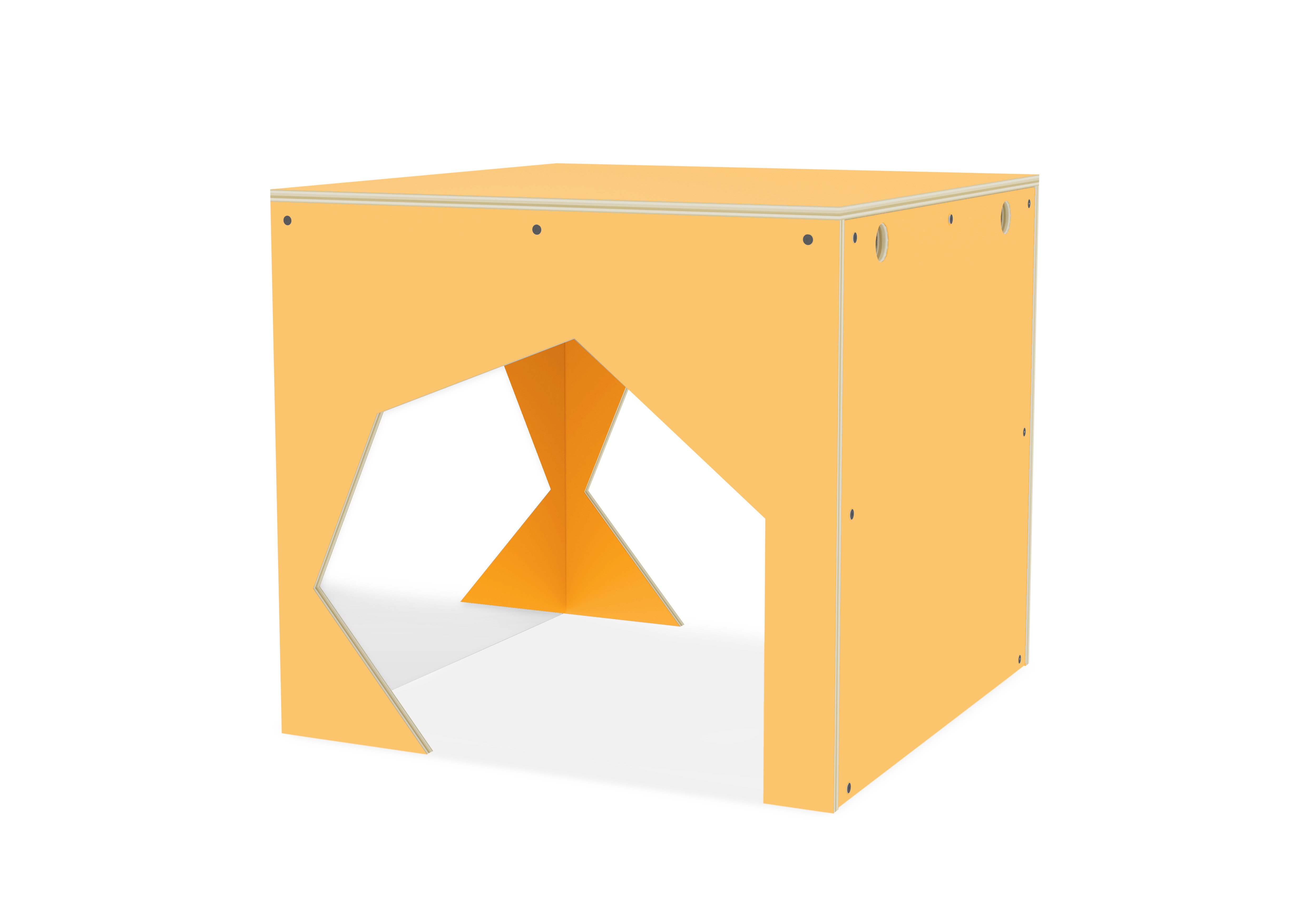 Färdig modul med hela insidan klädd i akrylspegel. Öppning utformad som en grotta. Gjord i 16 mm björkplywood. Färger med HT är med högtryckslaminat. Björk och vitpigmenterad är helt i 18 mm plywood. Mått: B117xH117xD117 cm.