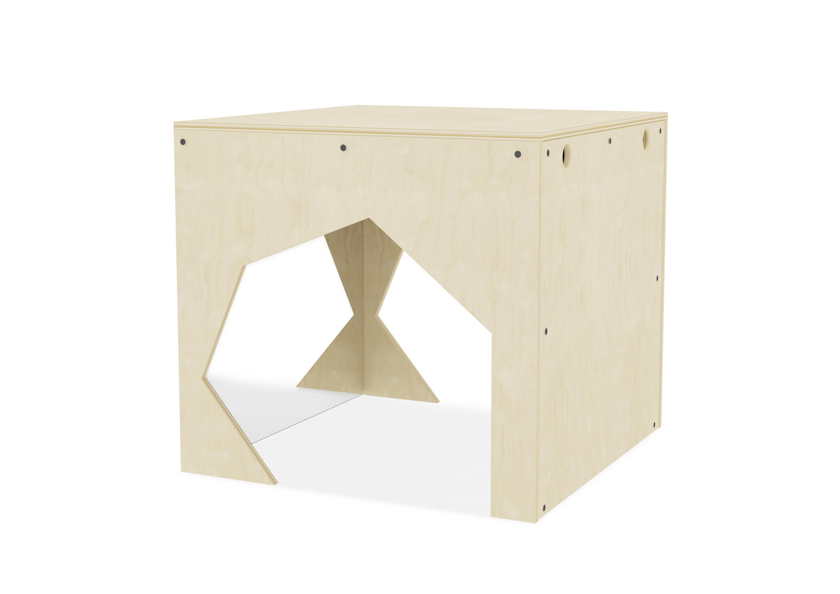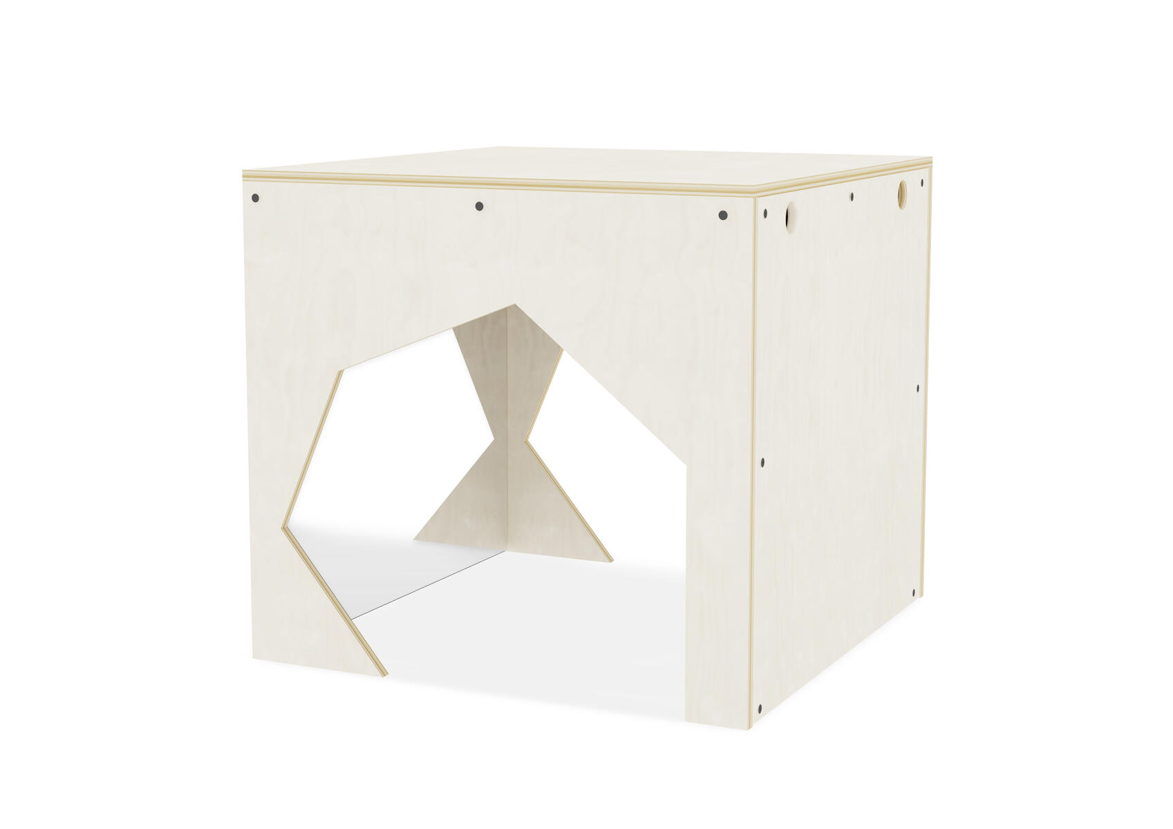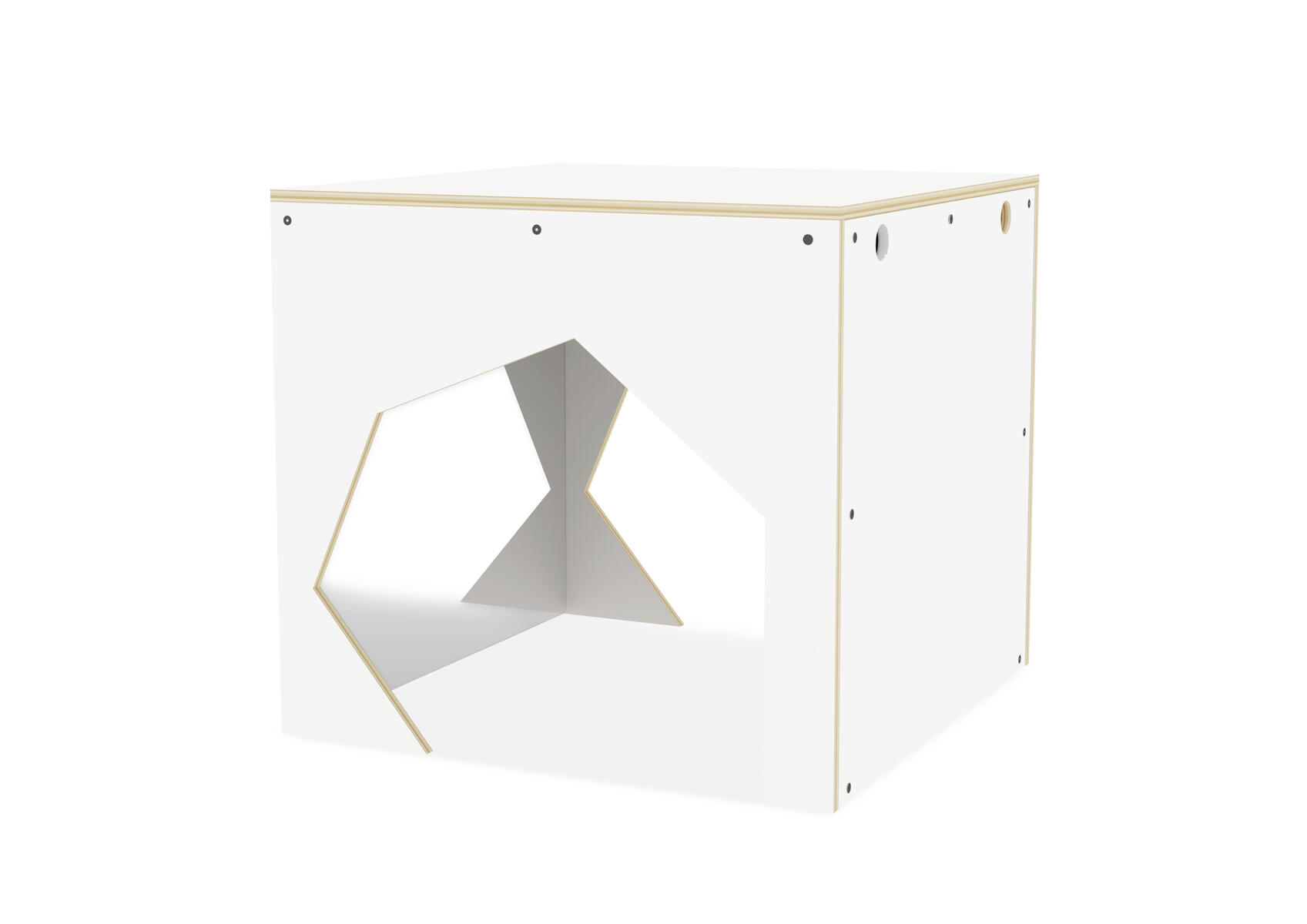 Färdig modul med hela insidan klädd i akrylspegel. Två öppningar utformade som grottor. Gjord i 16 mm björkplywood. Färger med HT är med högtryckslaminat. Björk och vitpigmenterad är helt i 18 mm plywood. Mått: B117xH117xD117 cm.