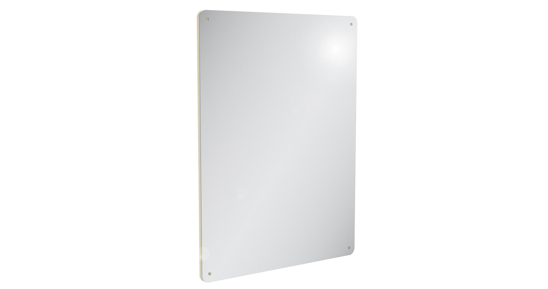 Spegel i akryl på en björkplywoodskiva. Repkänslig spegelyta, rengör endast med en lättfuktad mikroduk. Planförsänkta hål i alla hörn för att fästa på vägg.