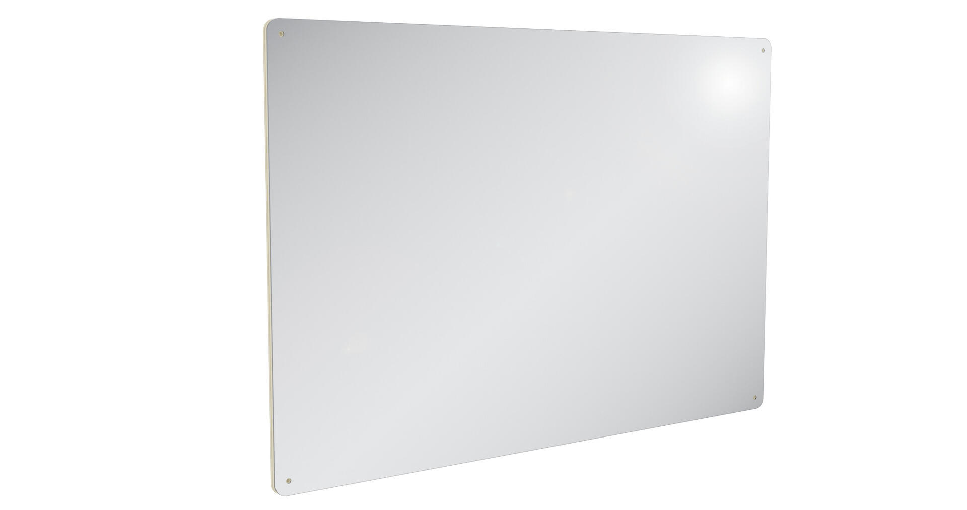 Spegel i akryl på en björkplywoodskiva. Repkänslig spegelyta, rengör endast med en lättfuktad mikroduk. Planförsänkta hål i alla hörn för att fästa på vägg.