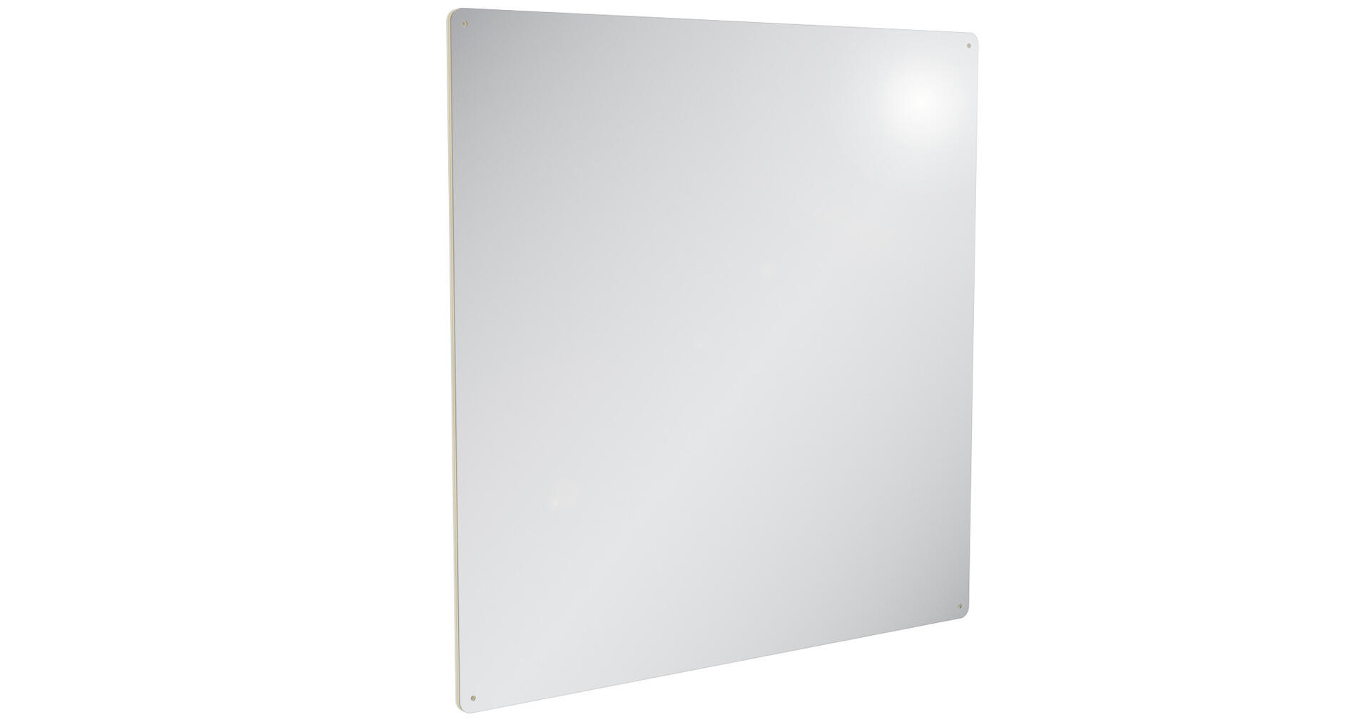 Spegel i akryl på en björkplywoodskiva. Repkänslig spegelyta, rengör endast med en lättfuktad mikroduk. Planförsänkta hål i alla hörn för att fästa på vägg.
