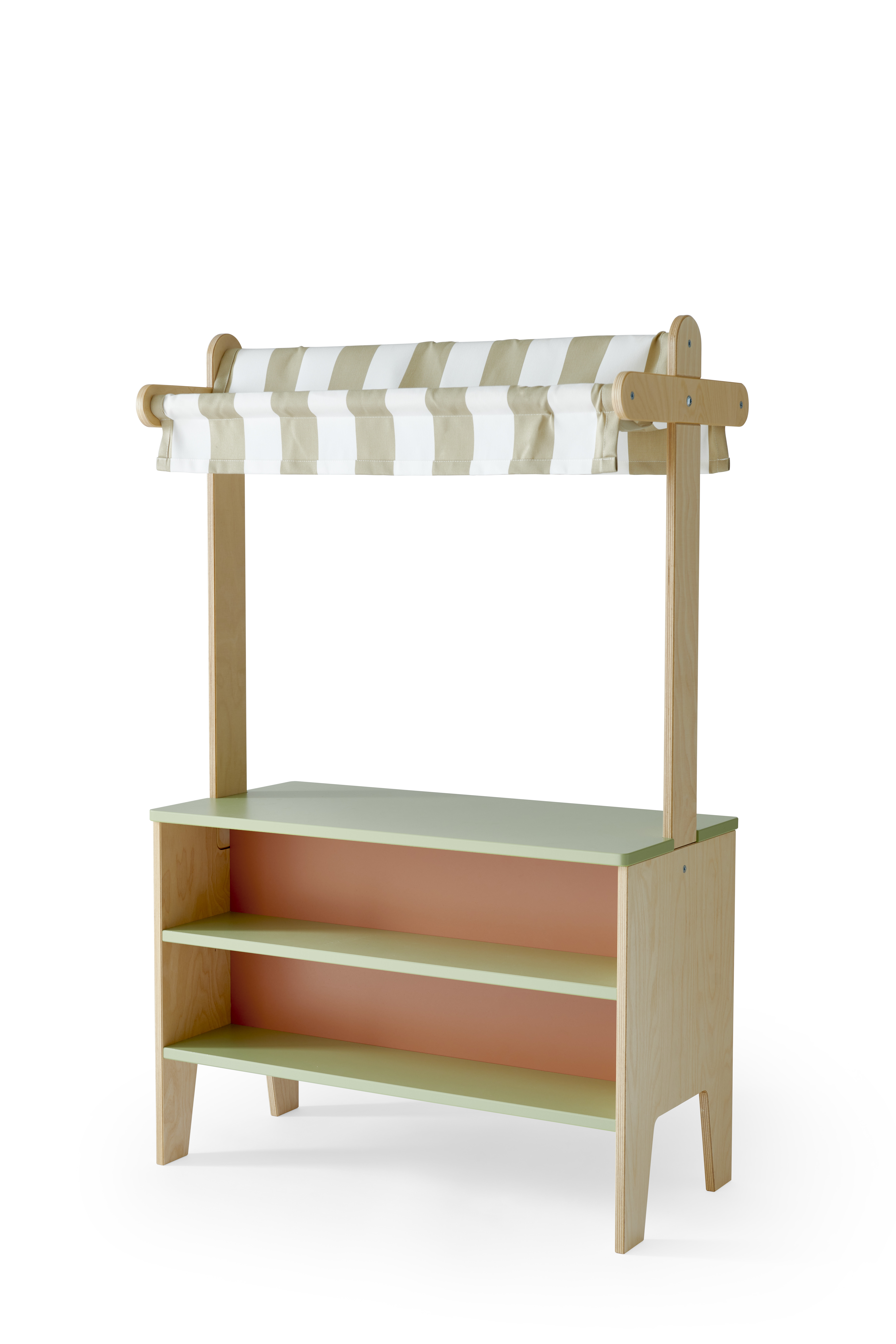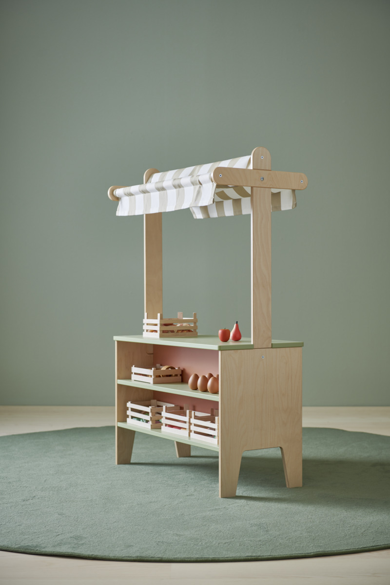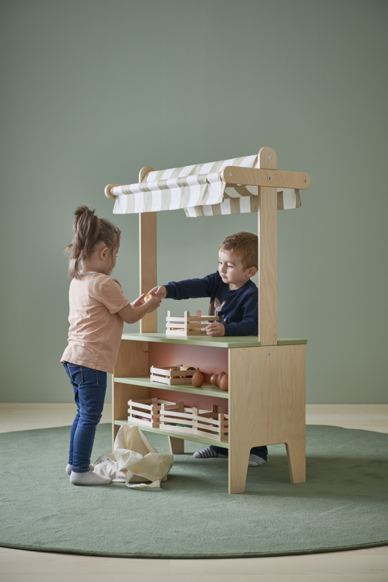 Ett stabilt och funktionellt marknadsstånd för stimulerande rollek. Barnen tränar på att turas om, att handla och att sälja, vilket ger en bra grund för matematiken. Framsida med hyllor för skyltning. Av kraftig, lackerad FSC-märkt plywood med markis av Oeko-Tex-godkänt tyg. Enkel montering av 2 delar. Tillbehör ingår ej. Höjd mellan golv och bänk: 53 cm.