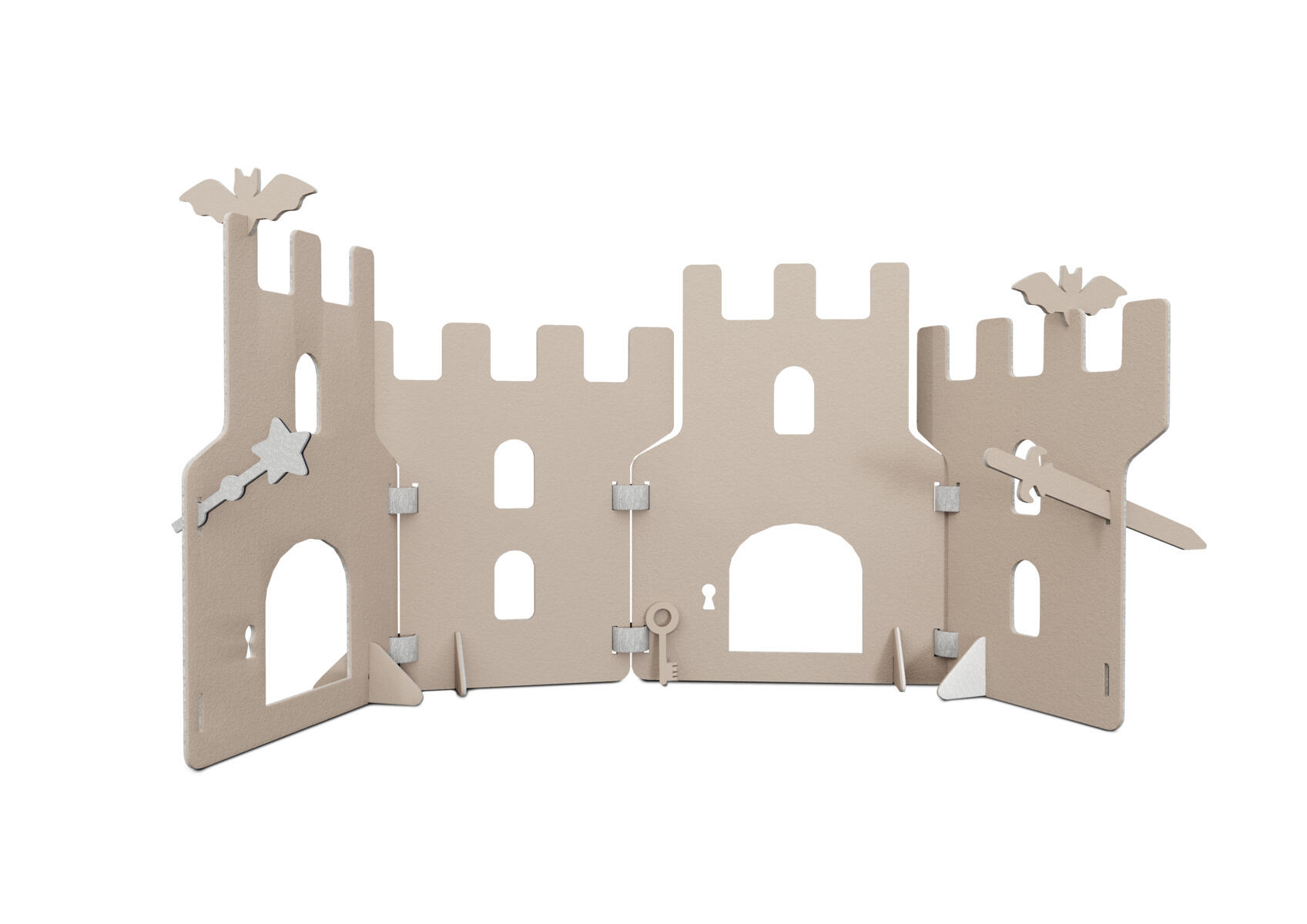 Lekskärmar i ljuddämpande filt. Används till scenografi, som rumsavdelare, krypin eller som förstärkande element i leken. Alla delar i Saga-serien kan användas tillsammans. En kombination av en fästning med 4 skärmar, 4 fötter och 6 gångjärn. Här ingår också två fladdermöss, ett svärd, en trollstav och en nyckel vilka kan monteras på lekskärmarna. Skärmarna är tvåfärgade, ena sidan är alltid ljusgrå. Fötter följer samma färgkombination som val av färg. Gångjärn är ljusgrå. Mått på skärmar: B58xH70 cm. Minst 50 % återvunnet material. 100 % återvinningsbar.