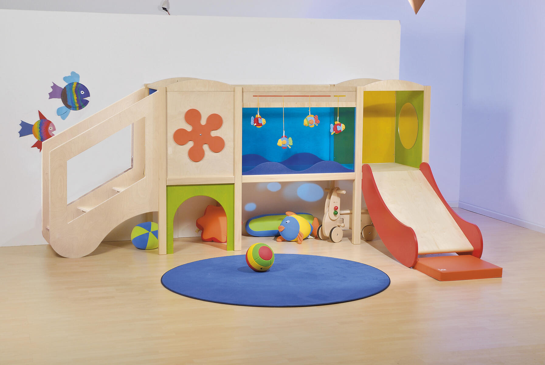 Med Tobiniserien kan du bygga ditt eget landskap efter plats och behov. Utgå från vilken bas som passar er verksamhet bäst och välj sedan tillval som stege, trappa eller rutschkana. Innehåller två torn sammanlänkade med ett akvarium med fiskar i 100 % bomull. (Rutschkana, trappa etc. ingår ej, se nedan.) Kan placeras centralt eller i rummets hörn. Med många olika materialval och taktila strukturer motiveras och uppmuntras barnens samspel mellan färger och former. Tillval går att beställa. Dekorationer och matta på bilden ingår ej. Tillbehören på bilden är: Tobini rutschkana 80448, Tobini trappa 80450. Mått: 233x66x130 cm. Höjd på plattform: 60 cm. För barn 1–5 år.