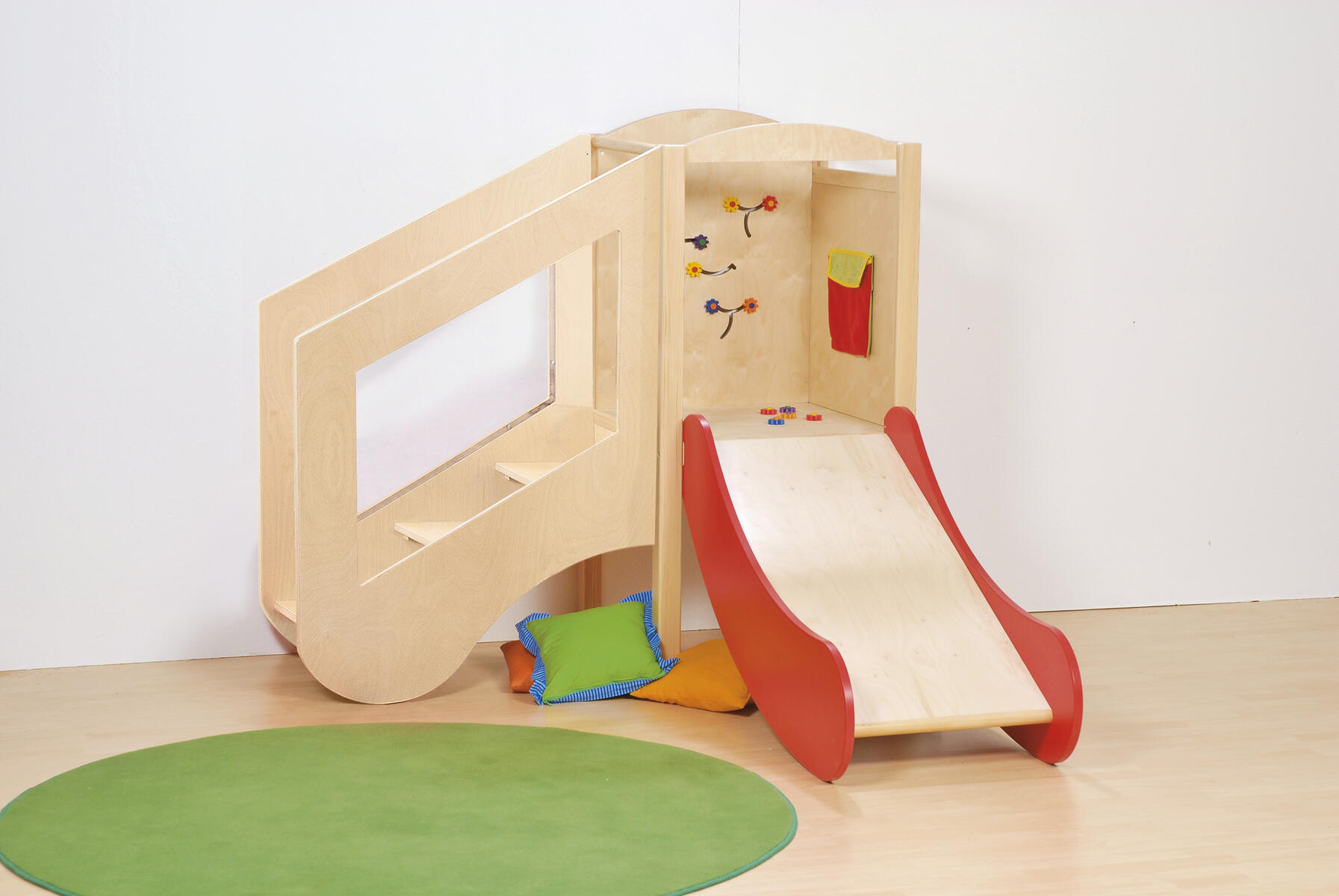 Med denna Tobini-serie kan du bygga ditt eget landskap efter plats och behov. Utgå från vilken bas som passar er verksamhet bäst och välj sedan tillval som stege, trappa eller rutschkana. Ett landskap som passar i de mindre rummen. Innehåller: ett torn med en vägg av blommor som man kan förflytta sidledes samt en vägg med väska. (Rutschkana, trappa etc. ingår ej, se nedan.) Kan placeras centralt eller i rummets hörn. Med många olika materialval och taktila strukturer motiveras och uppmuntras barnens samspel mellan färger och former. Tillval går att beställa. Dekorationer och matta på bilden ingår ej. Tillbehören på bilden är: Tobini rutschkana 80448, Tobini trappa 80450. Mått: 66x66x130 cm. Höjd på plattform: 60 cm. För barn mellan 1-5 år.