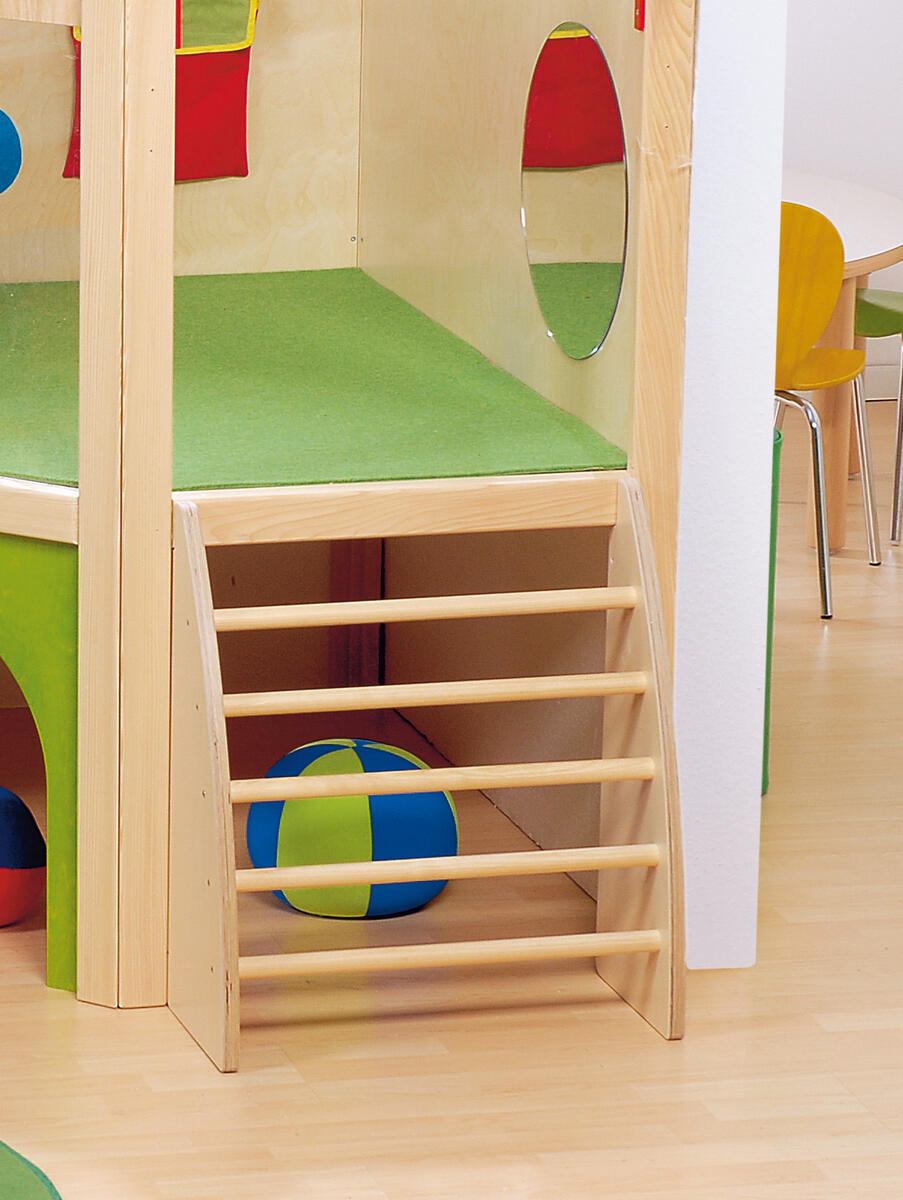 Med Tobiniserien kan du bygga ditt eget landskap efter plats och behov. Utgå från vilken bas som passar er verksamhet bäst och välj sedan tillval som stege, trappa eller rutschkana. Innehåller ett torn, hörna samt tunnel att krypa igenom med hål i tak för sensorisk upplevelse. Kan placeras centralt eller i rummets hörn. Med många olika materialval och taktila strukturer motiveras och uppmuntras barnens samspel mellan färger och former. Tillval går att beställa. Dekorationer och matta på bilden ingår ej. Tillbehören på bilden är: Tobini rutschkana 80448, Tobini vågtrappa 80454. I hörnmodulen finns det även en snurrande blomma samt spegel. 252x126x130 cm. Höjd på plattform: 60 cm. För barn 1–5 år.