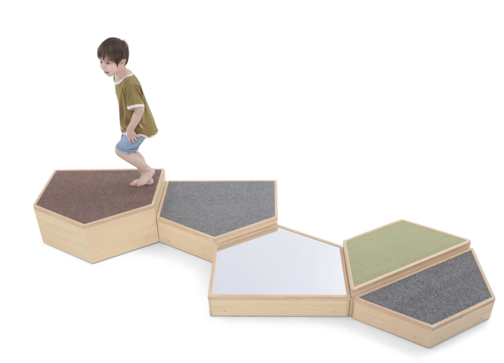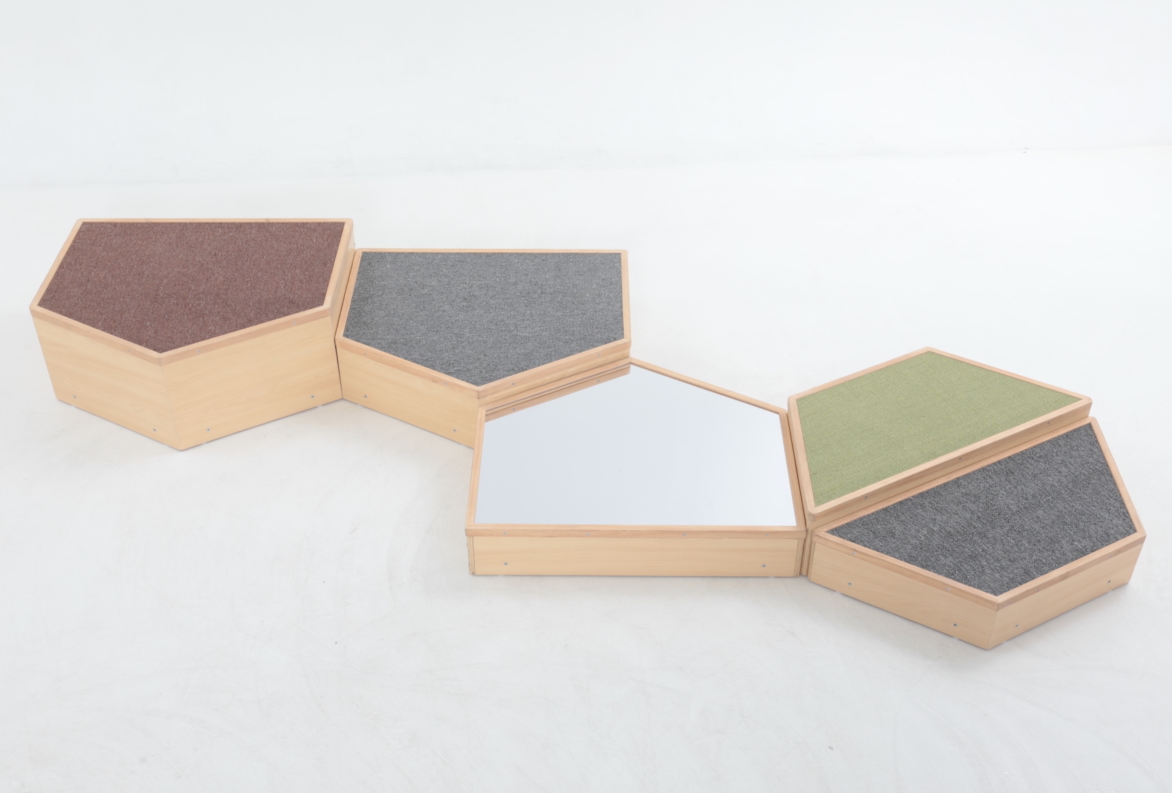 Fem podier med matta och spegel. Podier: femkantig med mörkbrun matta mått L79xB69xH30 cm, femkantig med spegel mått L79xB69xH15 cm, femkantig med grå matta mått L79xB69xH20 cm, trapetsformad med grå matta mått L90xB40xH15 cm, trapetsformad med grön matta mått L90xB40xH20 cm.