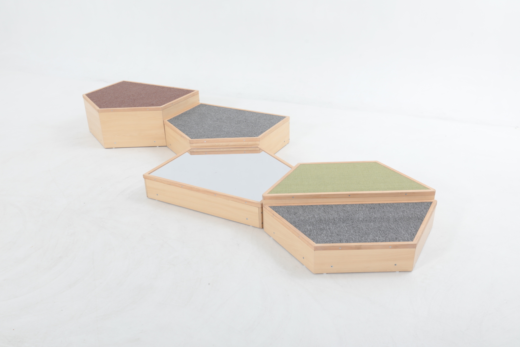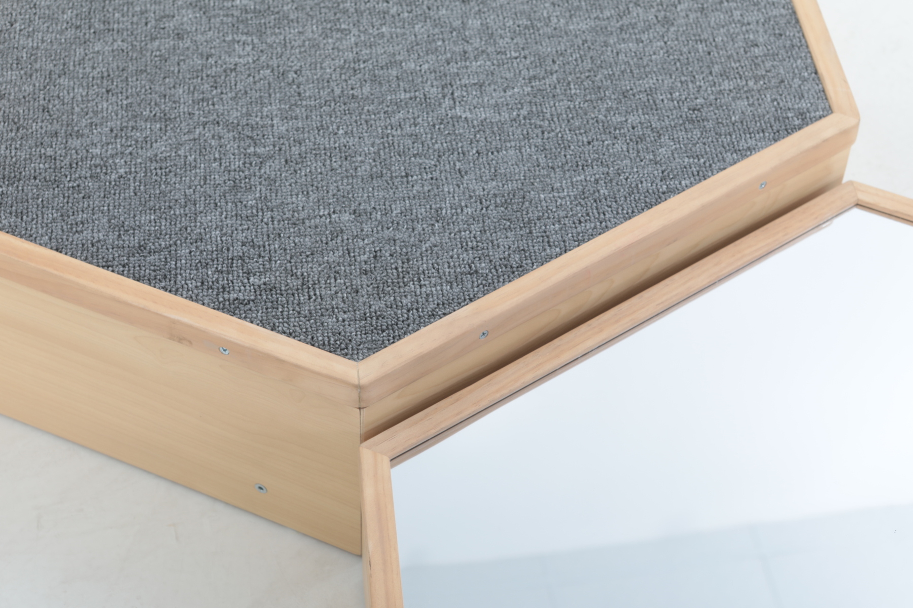 Fem podier med matta och genomskinligt golv. Podier: femkantig med observationsfönster och förvaringsutrymmes mått L79xB69xH20 cm, trapetsformad med grön matta mått L90xB40xH20 cm, femkantig med grön matta mått L79xB69xH15 cm, femkantig med grå matta mått L79xB69xH20 cm, femkantig med mörkbrun matta mått L79xB69xH30 cm