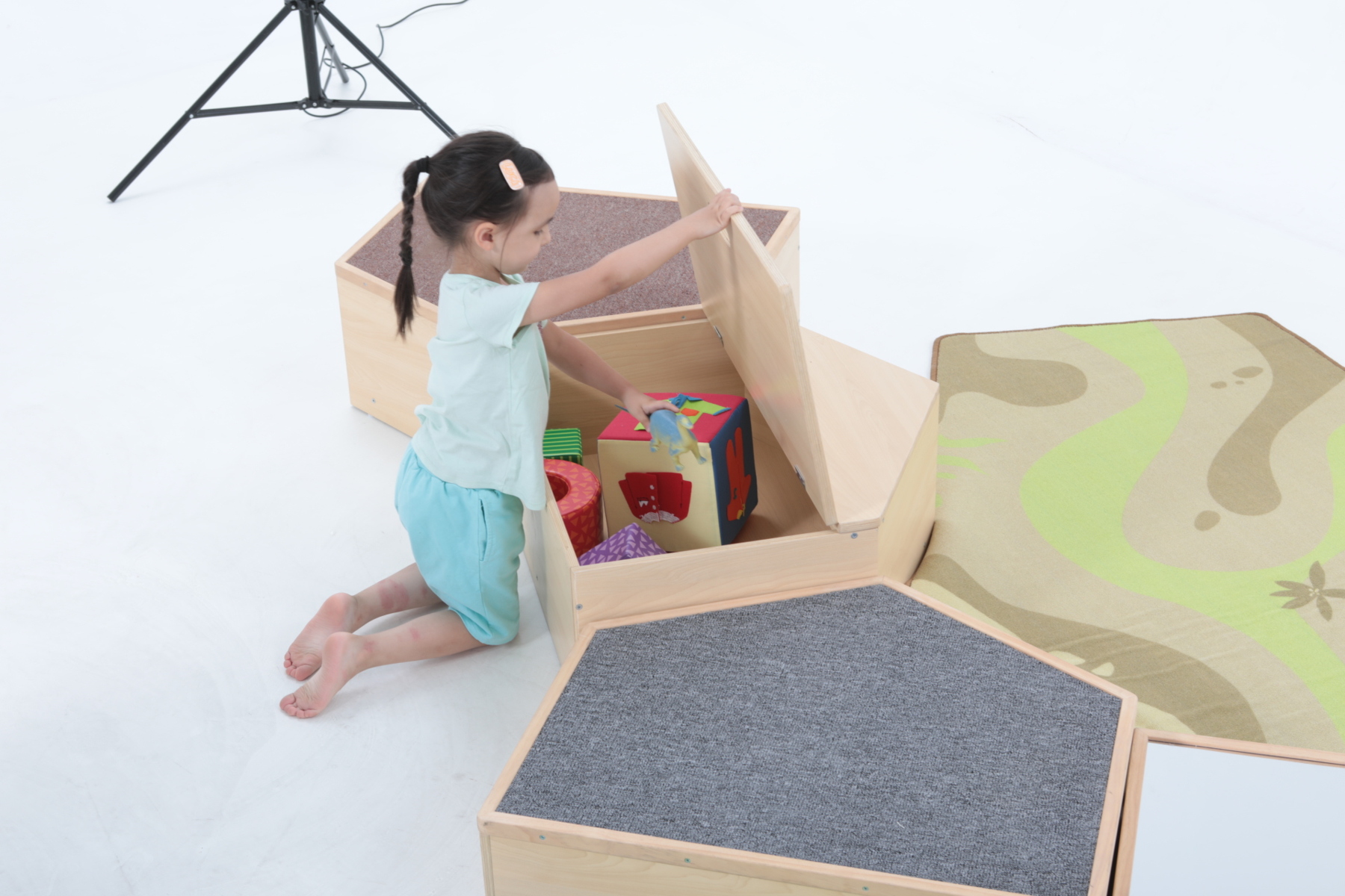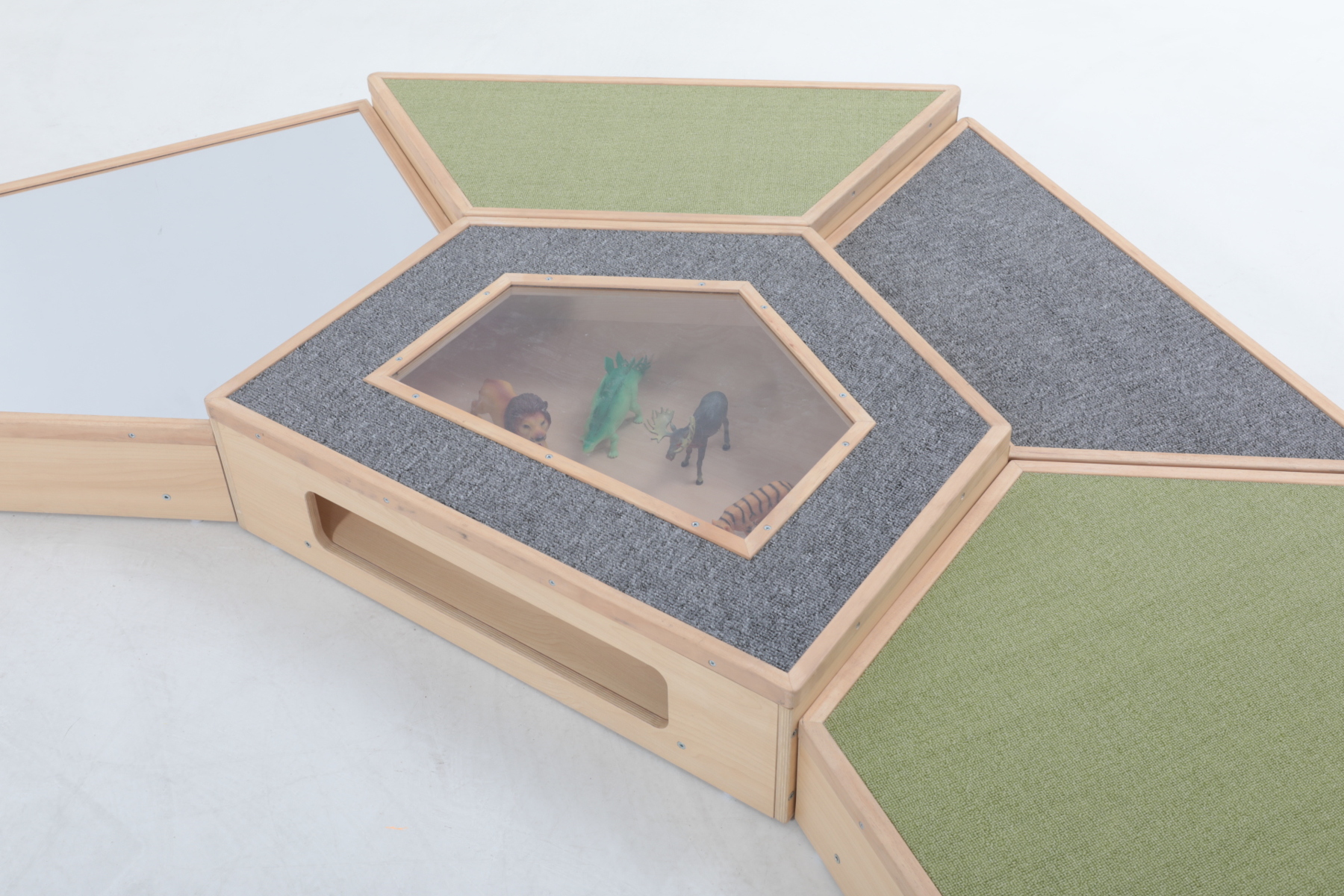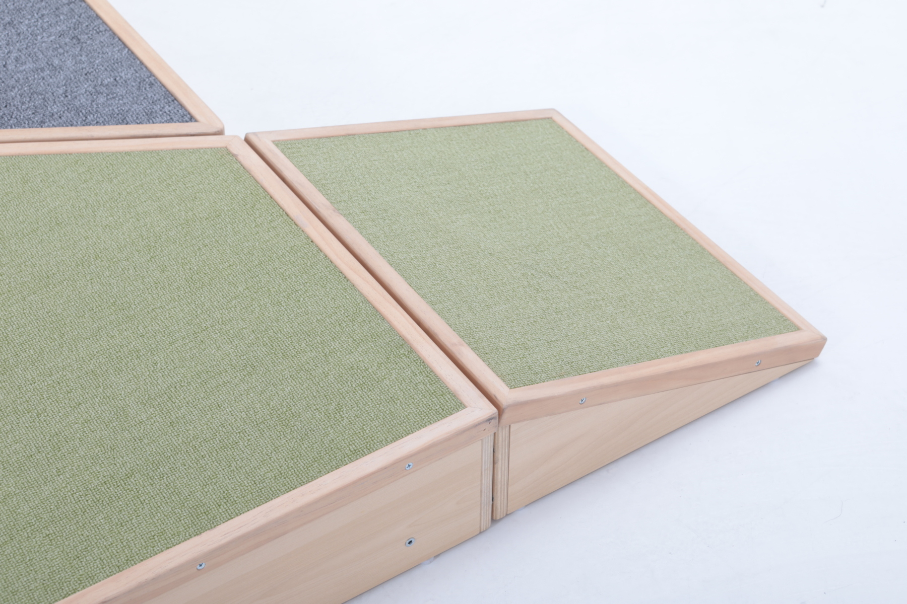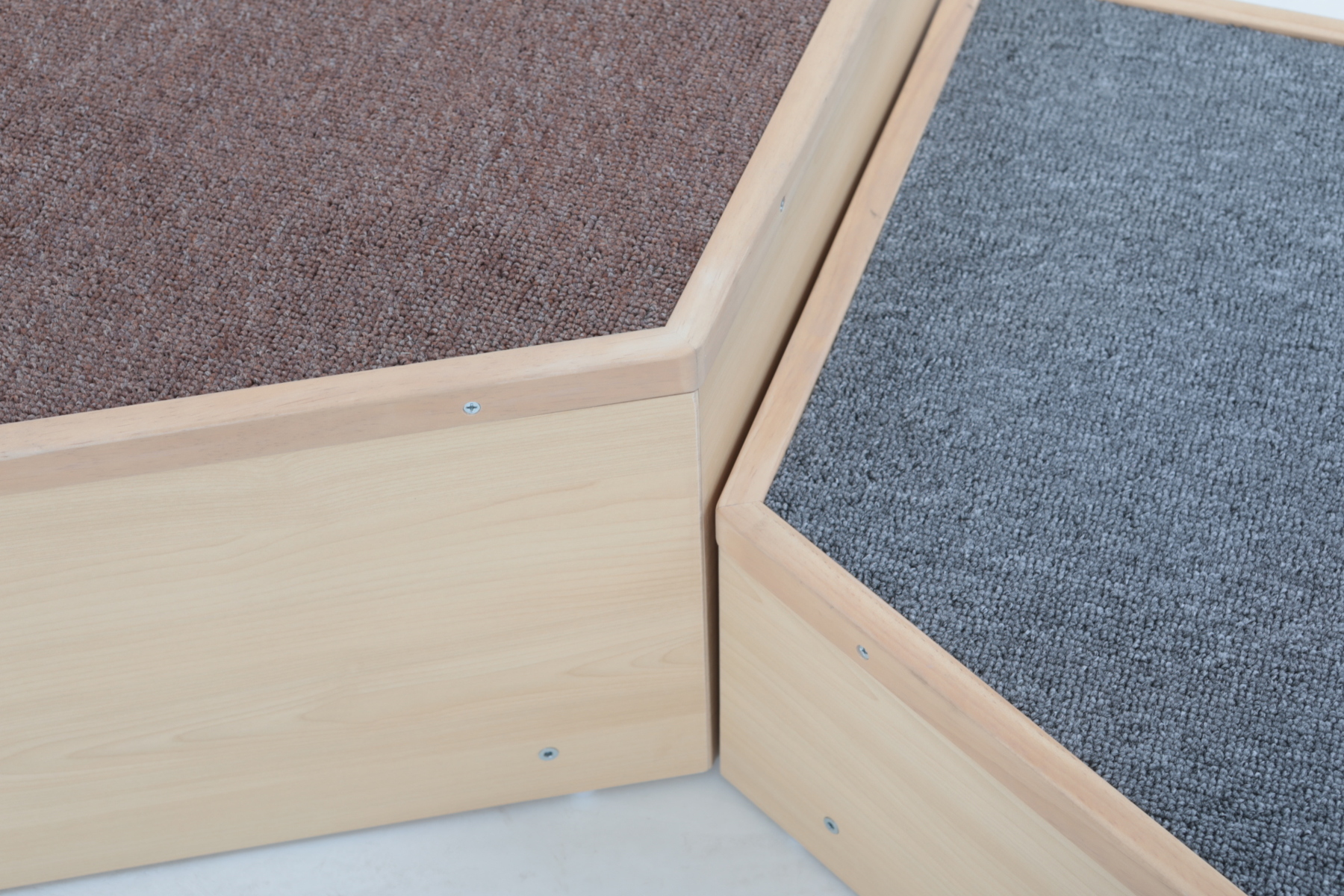 Fem podier med matta och genomskinligt golv. Podier: femkantig med observationsfönster och förvaringsutrymmes mått L79xB69xH20 cm, trapetsformad med grön matta mått L90xB40xH20 cm, femkantig med grön matta mått L79xB69xH15 cm, femkantig med grå matta mått L79xB69xH20 cm, femkantig med mörkbrun matta mått L79xB69xH30 cm