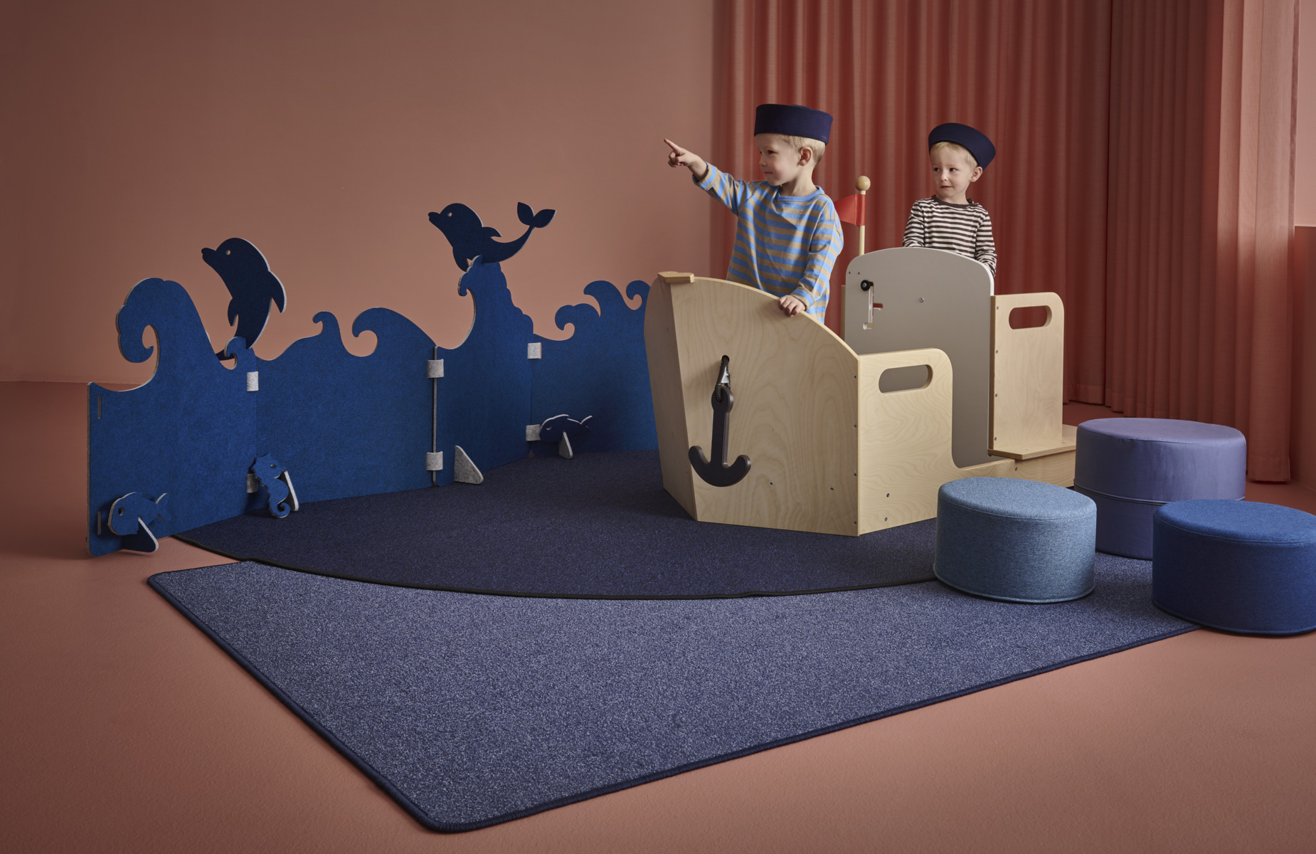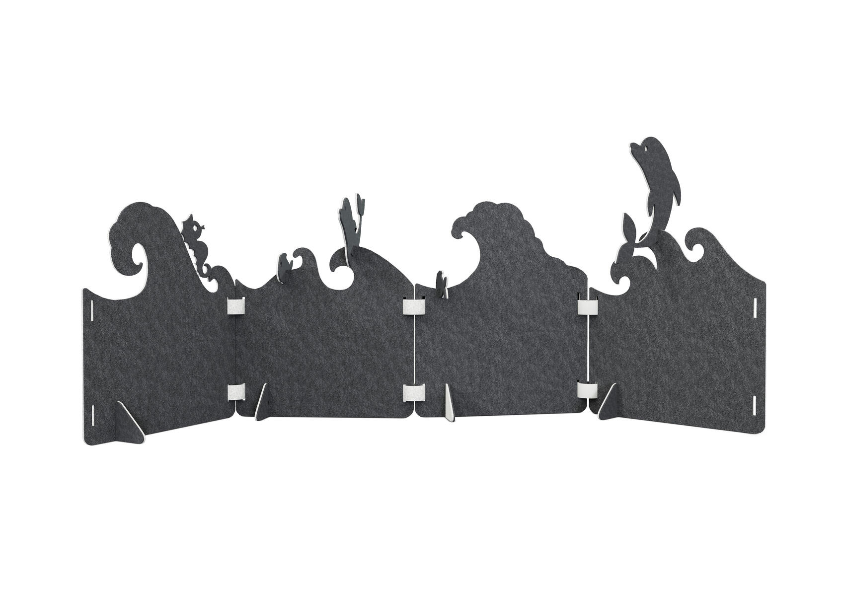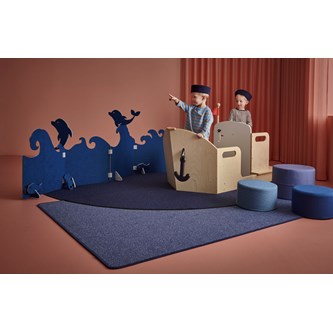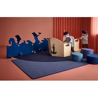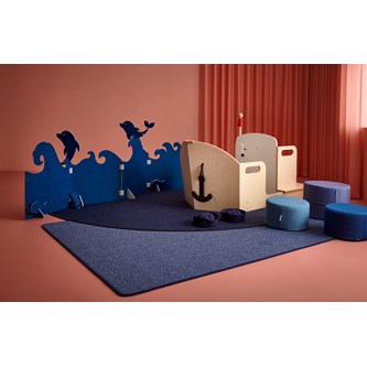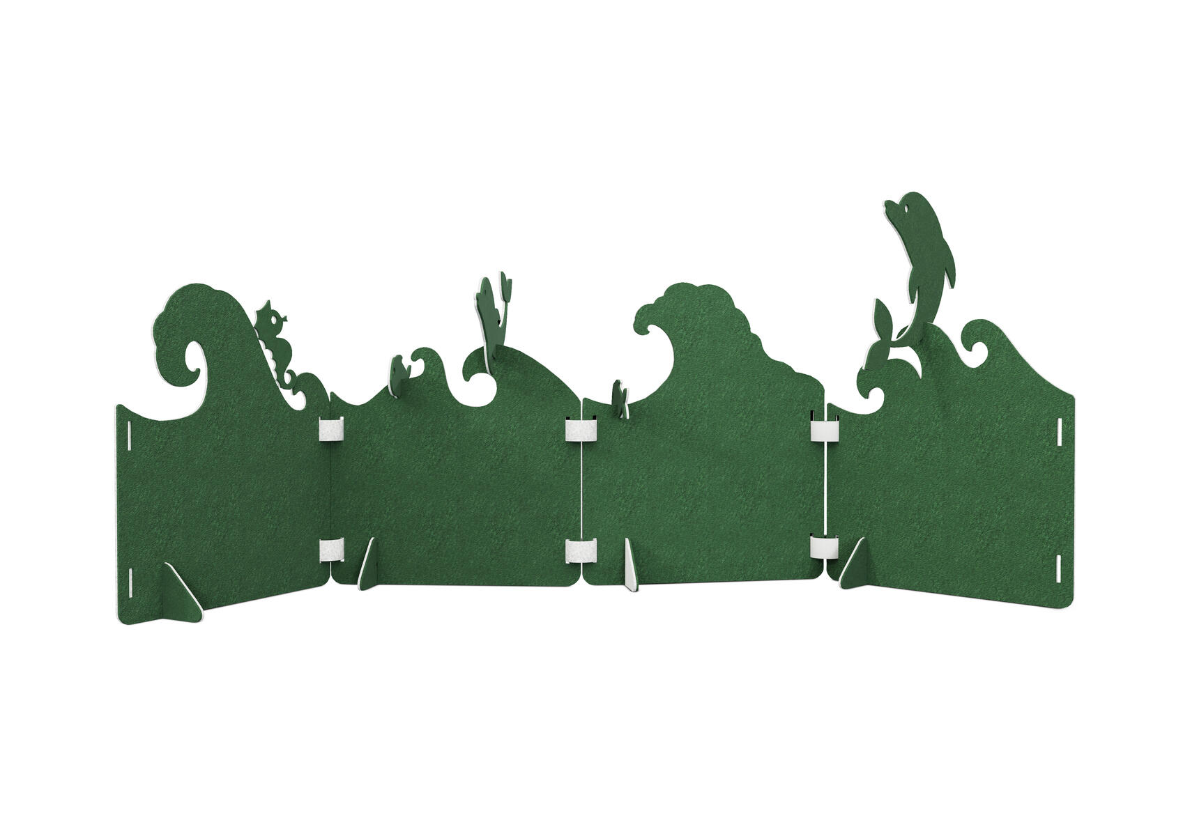 Lekskärmar i ljuddämpande filt. Används till scenografi, som rumsavdelare, krypin eller som förstärkande element i leken. Alla delar i Saga-serien kan användas tillsammans. En kombination av ett hav med 4 skärmar, 4 fötter och 6 gångjärn. Här ingår också en sjöhäst, två fiskar och två delfiner vilka kan monteras på lekskärmarna. Skärmarna är tvåfärgade, ena sidan är alltid ljusgrå. Fötter följer samma färgkombination som val av färg. Gångjärn är ljusgrå. Mått på skärmar: B58xH70 cm. Minst 50 % återvunnet material. 100 % återvinningsbar.