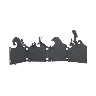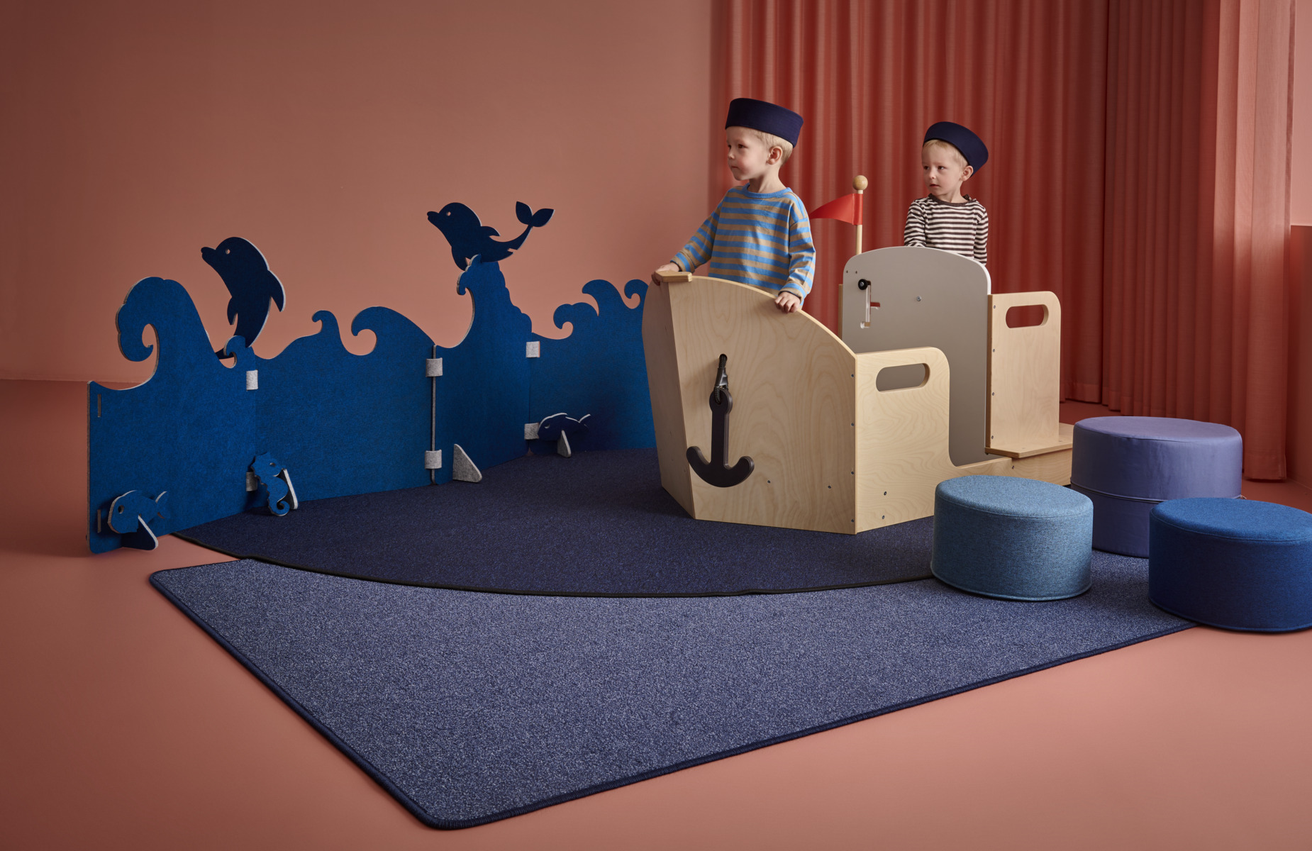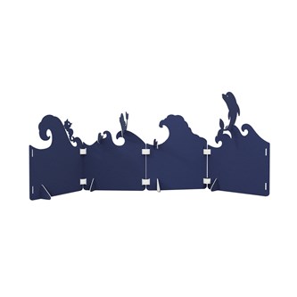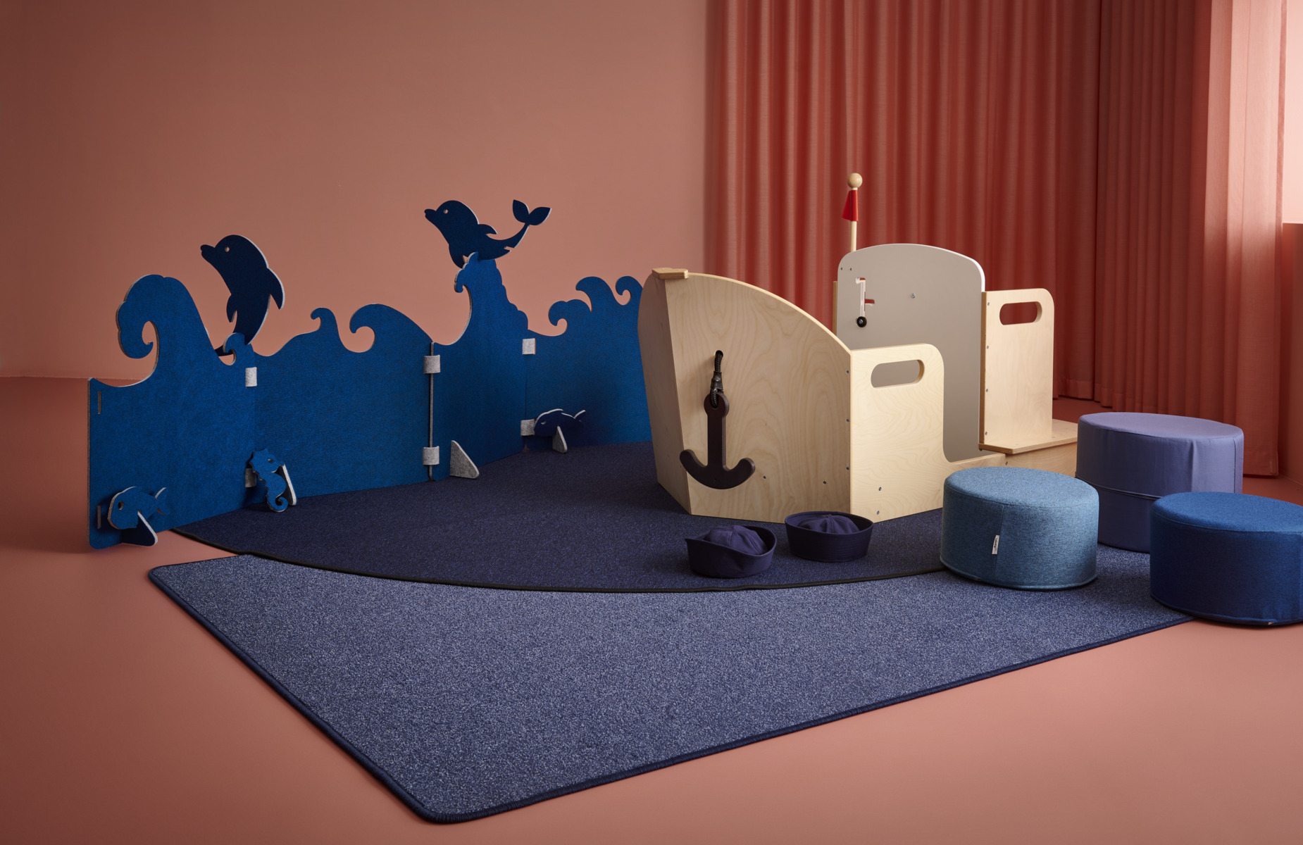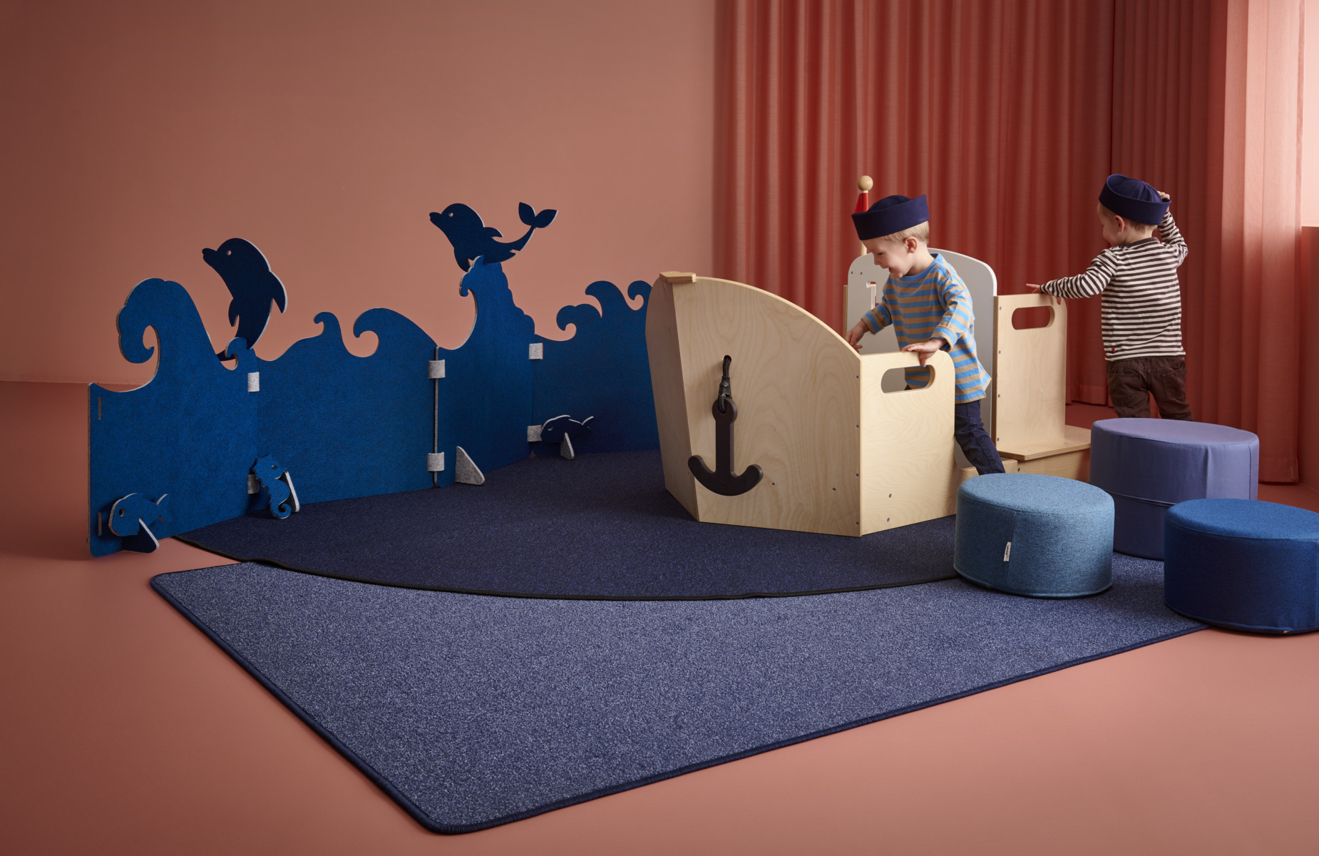 Lekskärmar i ljuddämpande filt. Används till scenografi, som rumsavdelare, krypin eller som förstärkande element i leken. Alla delar i Saga-serien kan användas tillsammans. En kombination av ett hav med 4 skärmar, 4 fötter och 6 gångjärn. Här ingår också en sjöhäst, två fiskar och två delfiner vilka kan monteras på lekskärmarna. Skärmarna är tvåfärgade, ena sidan är alltid ljusgrå. Fötter följer samma färgkombination som val av färg. Gångjärn är ljusgrå. Mått på skärmar: B58xH70 cm. Minst 50 % återvunnet material. 100 % återvinningsbar.