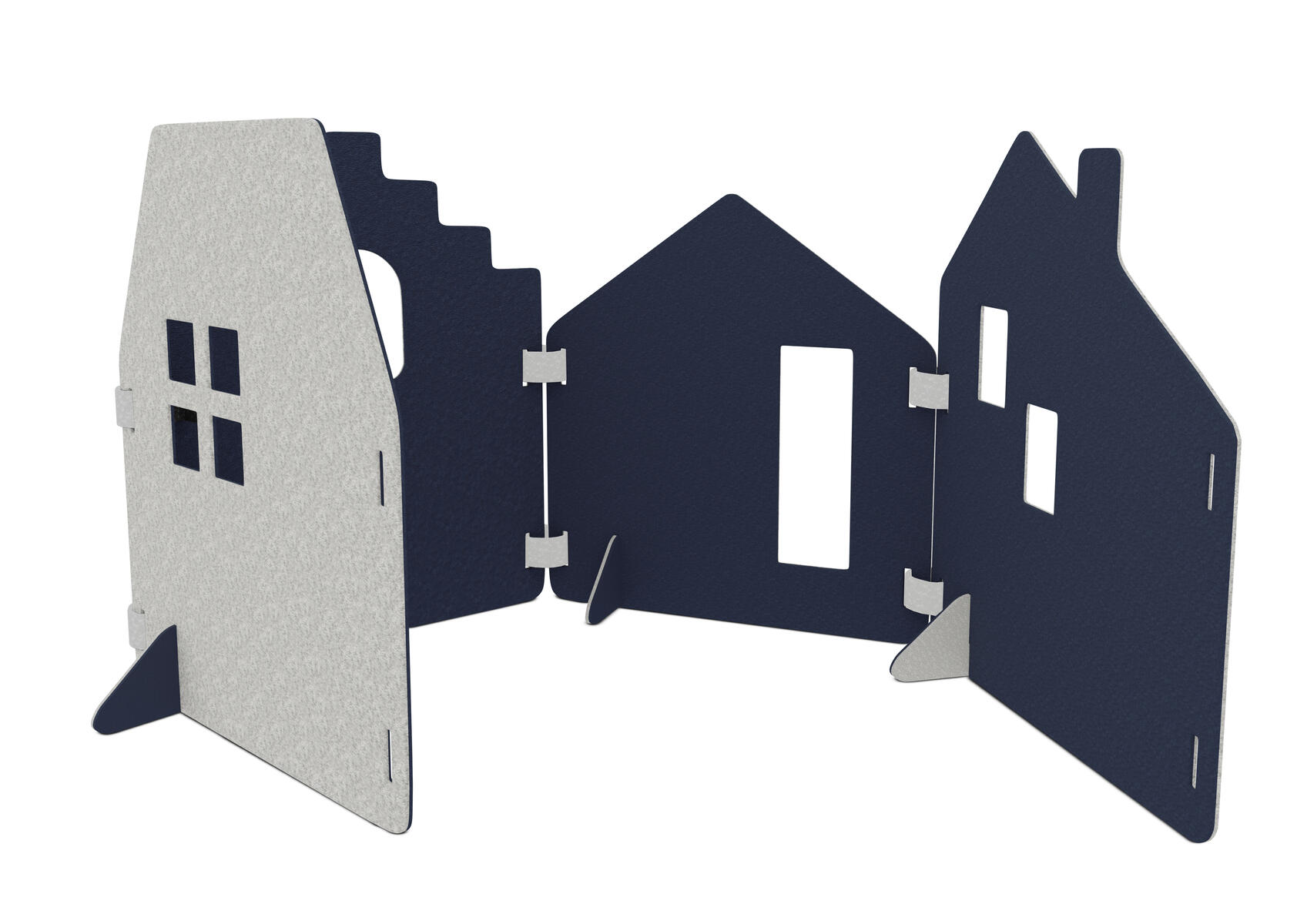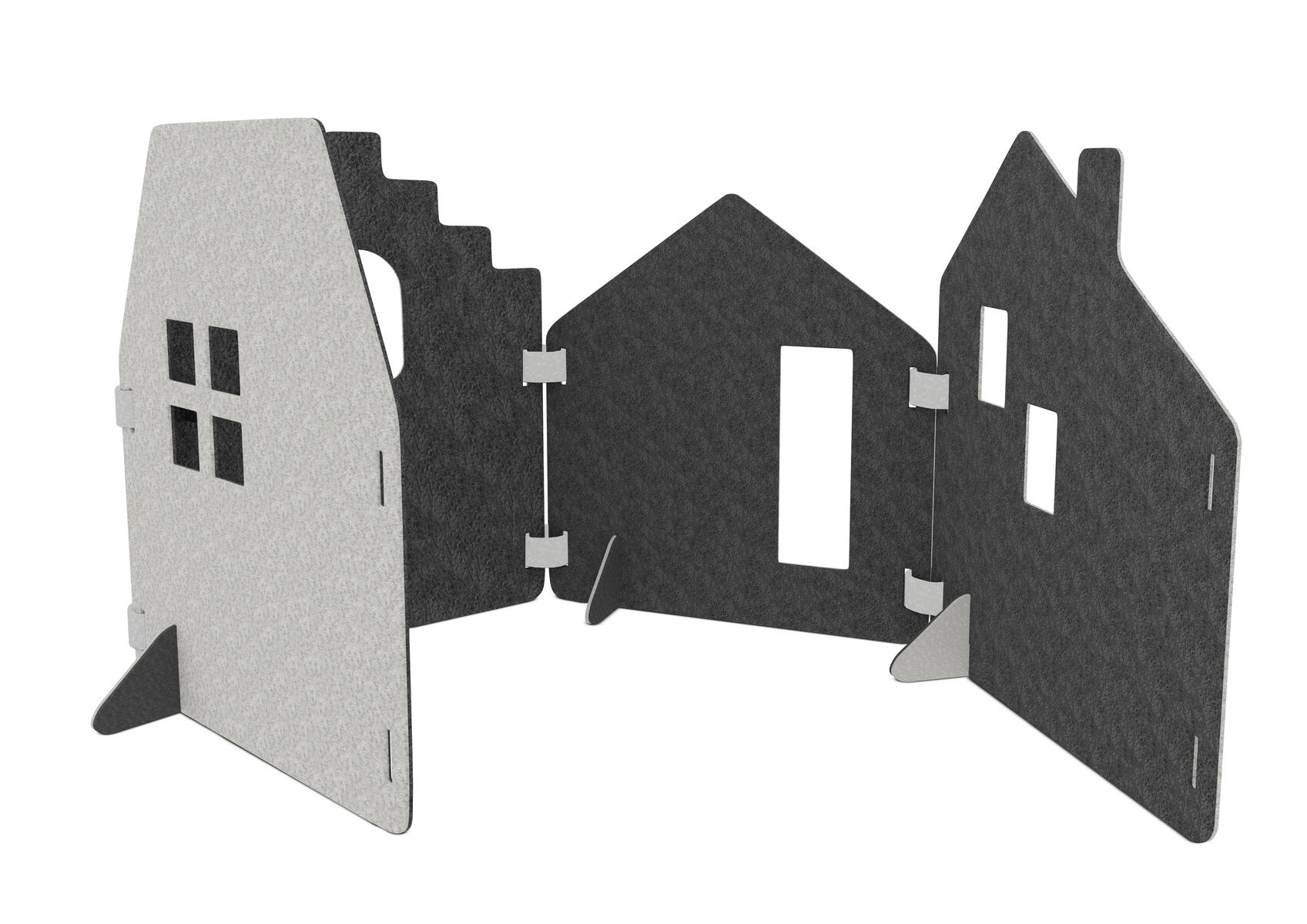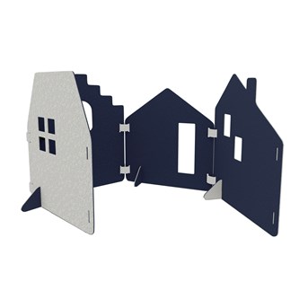 Lekskärmar i ljuddämpande filt. Används till scenografi, som rumsavdelare, krypin eller som förstärkande element i leken. Alla delar i Saga-serien kan användas tillsammans. En kombination av stad/hus med 4 skärmar, 4 fötter och 6 gångjärn. Skärmarna är tvåfärgade, ena sidan är alltid ljusgrå. Fötter följer samma färgkombination som val av färg. Gångjärn är ljusgrå. Mått på skärmar: B58xH70 cm. Minst 50 % återvunnet material. 100 % återvinningsbar.