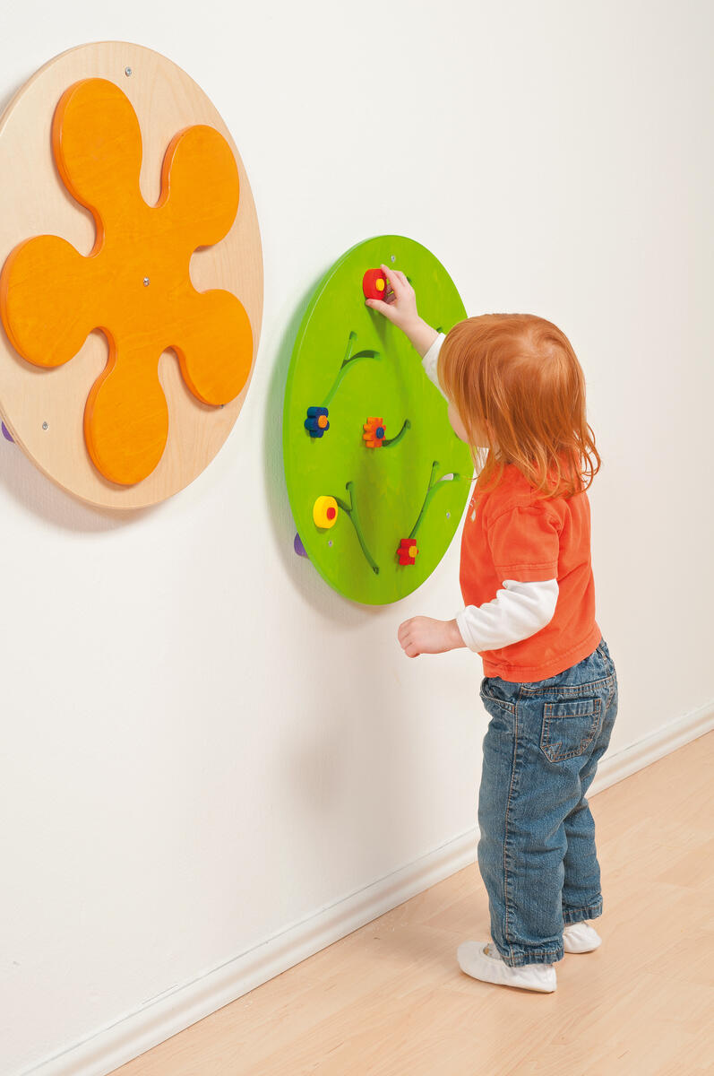 Lekpanel med färgade pinnar. De färgade pinnarna kan snurra 360° och kan därför användas på båda sidor och av flera barn samtidigt. Rörelsen och färgerna på denna lekpanel erbjuder både en kinetisk och visuell utmaning. Kan monteras på vägg, stående eller som en kub med hjälp av fötter som kan beställas separat. Björkkryssfaner. För de allra minsta, 0-3 år.