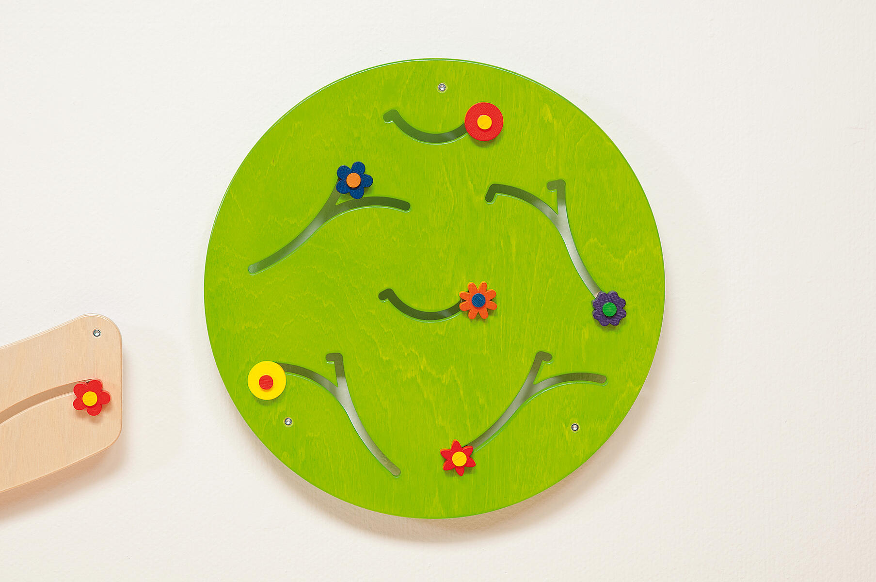 Lekpanel med labyrint. Panelen erbjuder tre olika spår med ett klot som är format att passa ett litet barns hand. Kan monteras på vägg, stående eller som en kub med hjälp av fötter som kan beställas separat. Björkkryssfaner. För de allra minsta, 0-3 år.