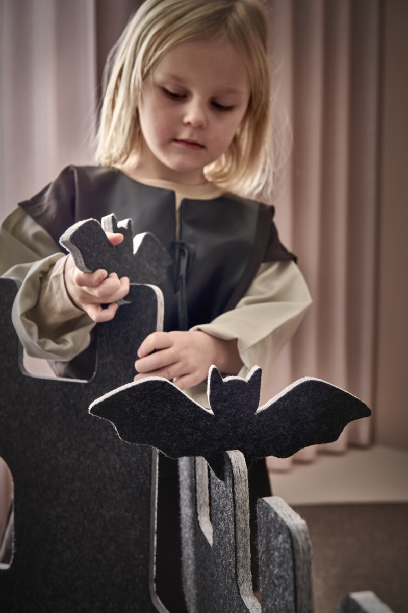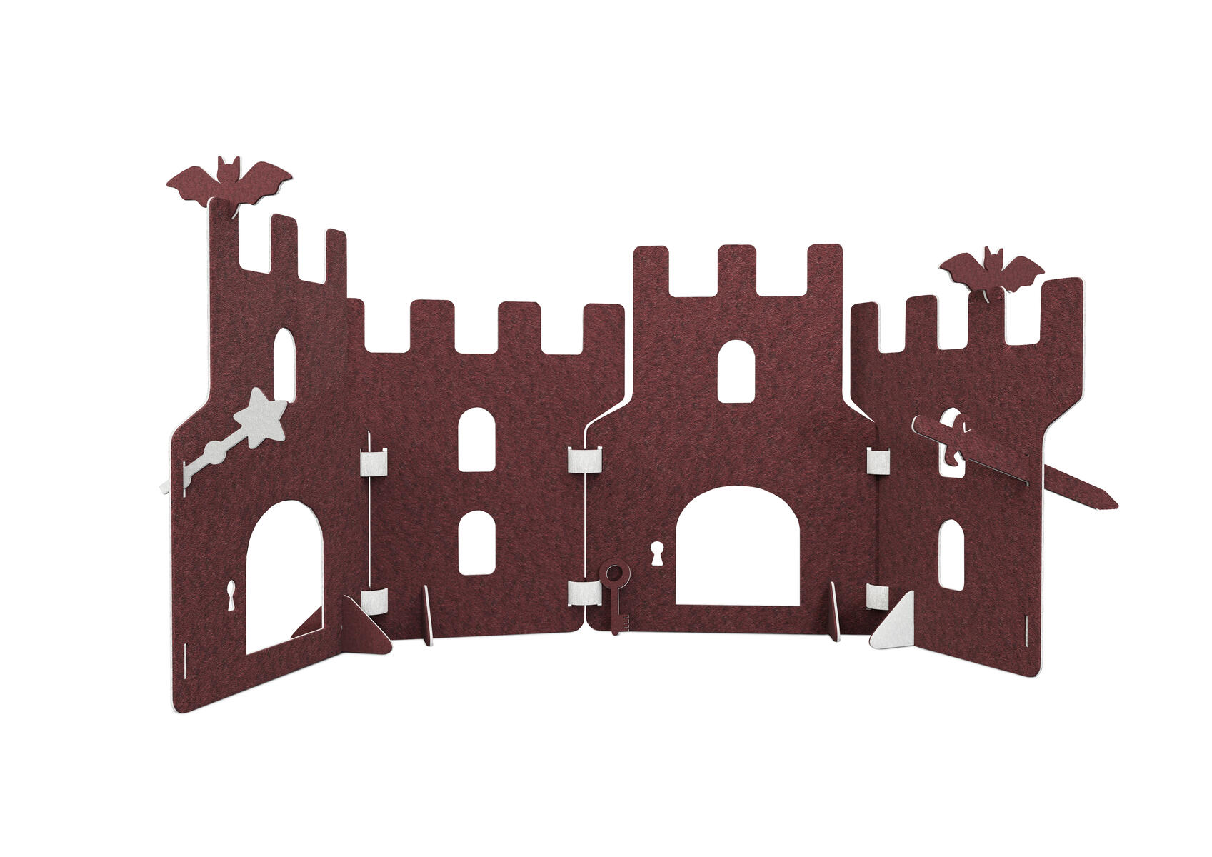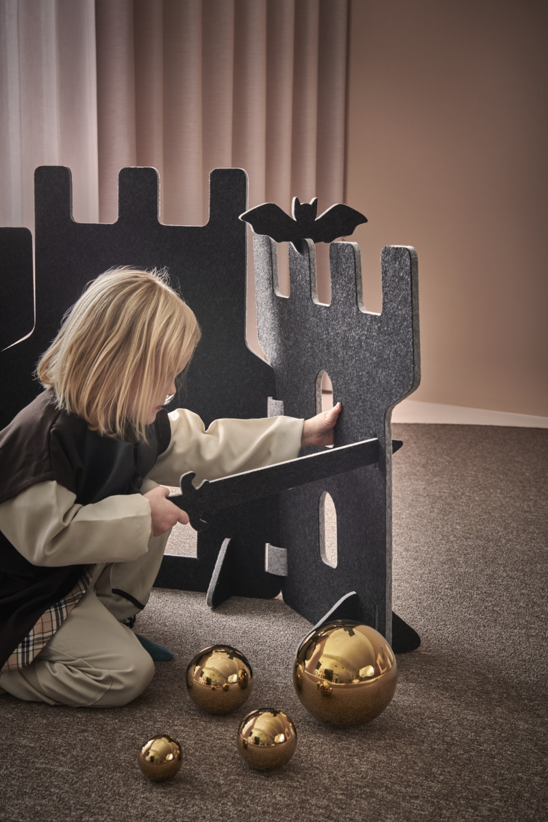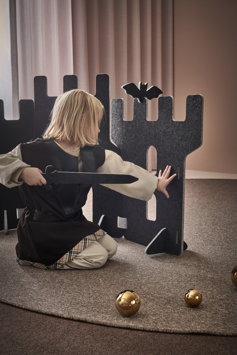 Lekskärmar i ljuddämpande filt. Används till scenografi, som rumsavdelare, krypin eller som förstärkande element i leken. Alla delar i Saga-serien kan användas tillsammans. En kombination av en fästning med 4 skärmar, 4 fötter och 6 gångjärn. Här ingår också två fladdermöss, ett svärd, en trollstav och en nyckel vilka kan monteras på lekskärmarna. Skärmarna är tvåfärgade, ena sidan är alltid ljusgrå. Fötter följer samma färgkombination som val av färg. Gångjärn är ljusgrå. Mått på skärmar: B58xH70 cm. Minst 50 % återvunnet material. 100 % återvinningsbar.
