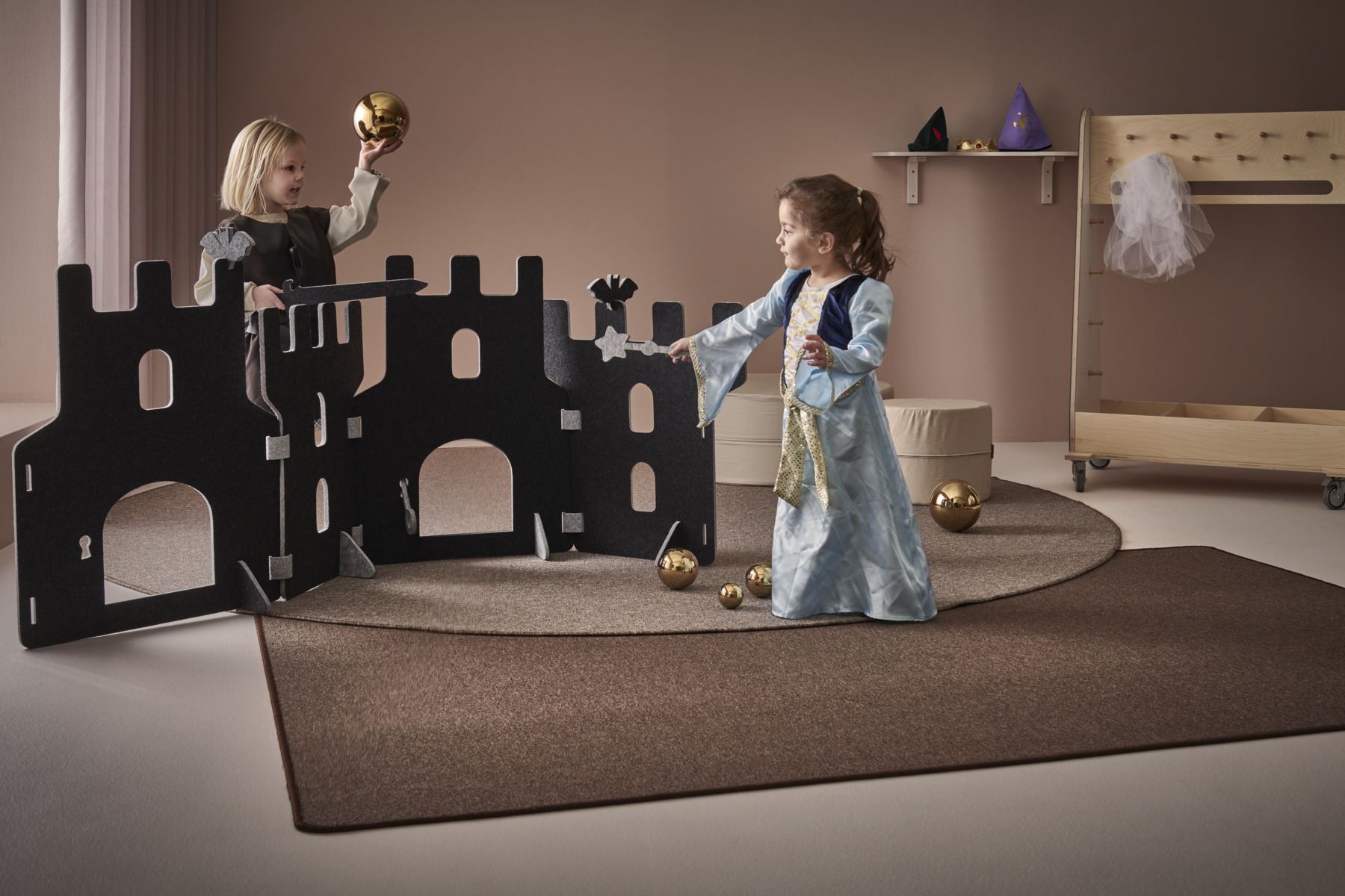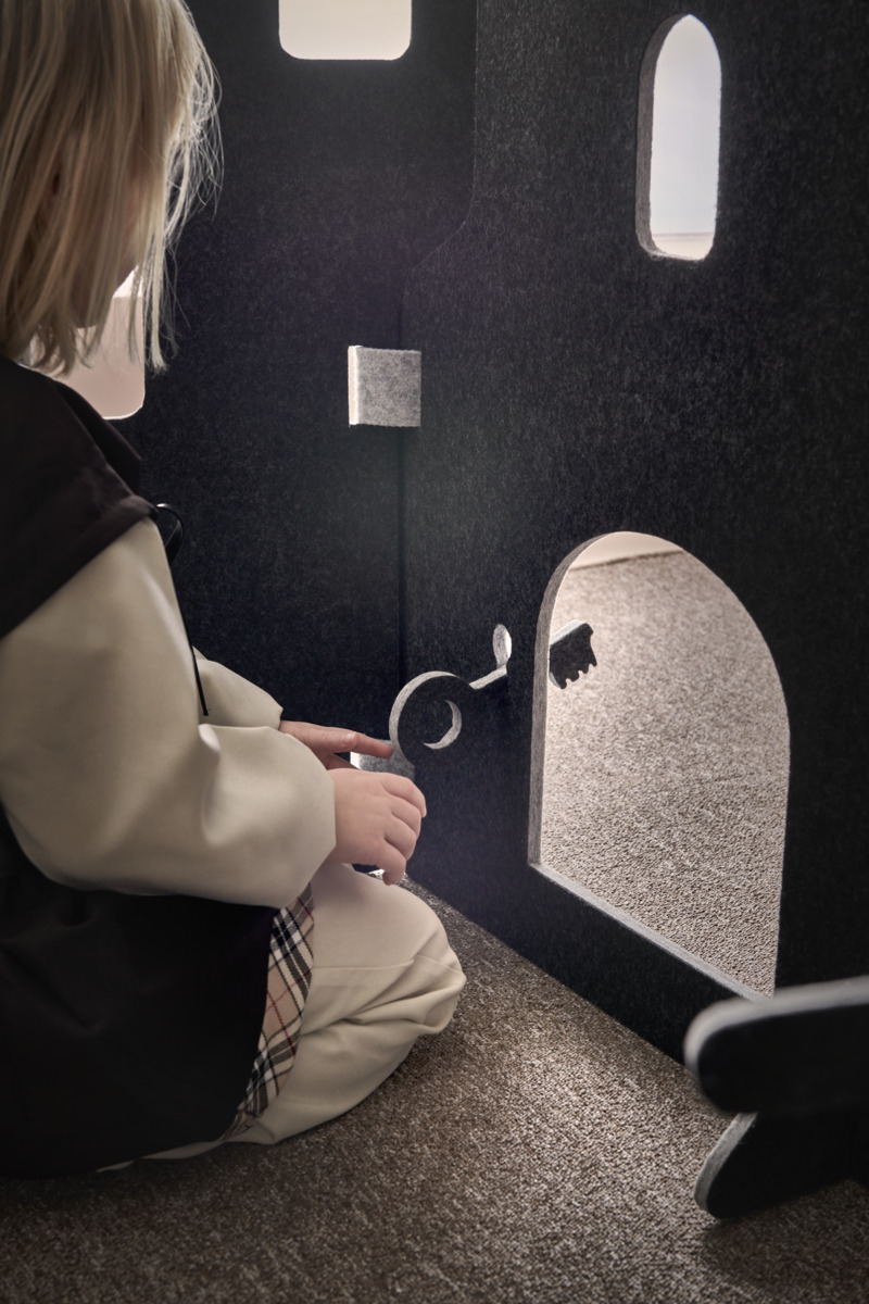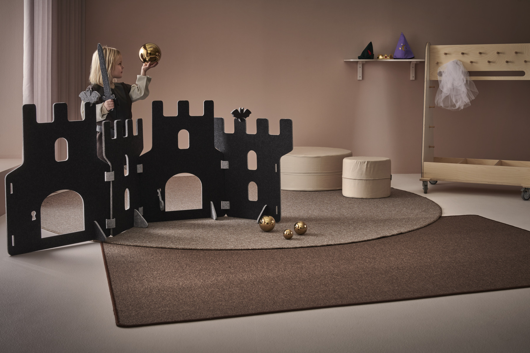 Lekskärmar i ljuddämpande filt. Används till scenografi, som rumsavdelare, krypin eller som förstärkande element i leken. Alla delar i Saga-serien kan användas tillsammans. En kombination av en fästning med 4 skärmar, 4 fötter och 6 gångjärn. Här ingår också två fladdermöss, ett svärd, en trollstav och en nyckel vilka kan monteras på lekskärmarna. Skärmarna är tvåfärgade, ena sidan är alltid ljusgrå. Fötter följer samma färgkombination som val av färg. Gångjärn är ljusgrå. Mått på skärmar: B58xH70 cm. Minst 50 % återvunnet material. 100 % återvinningsbar.