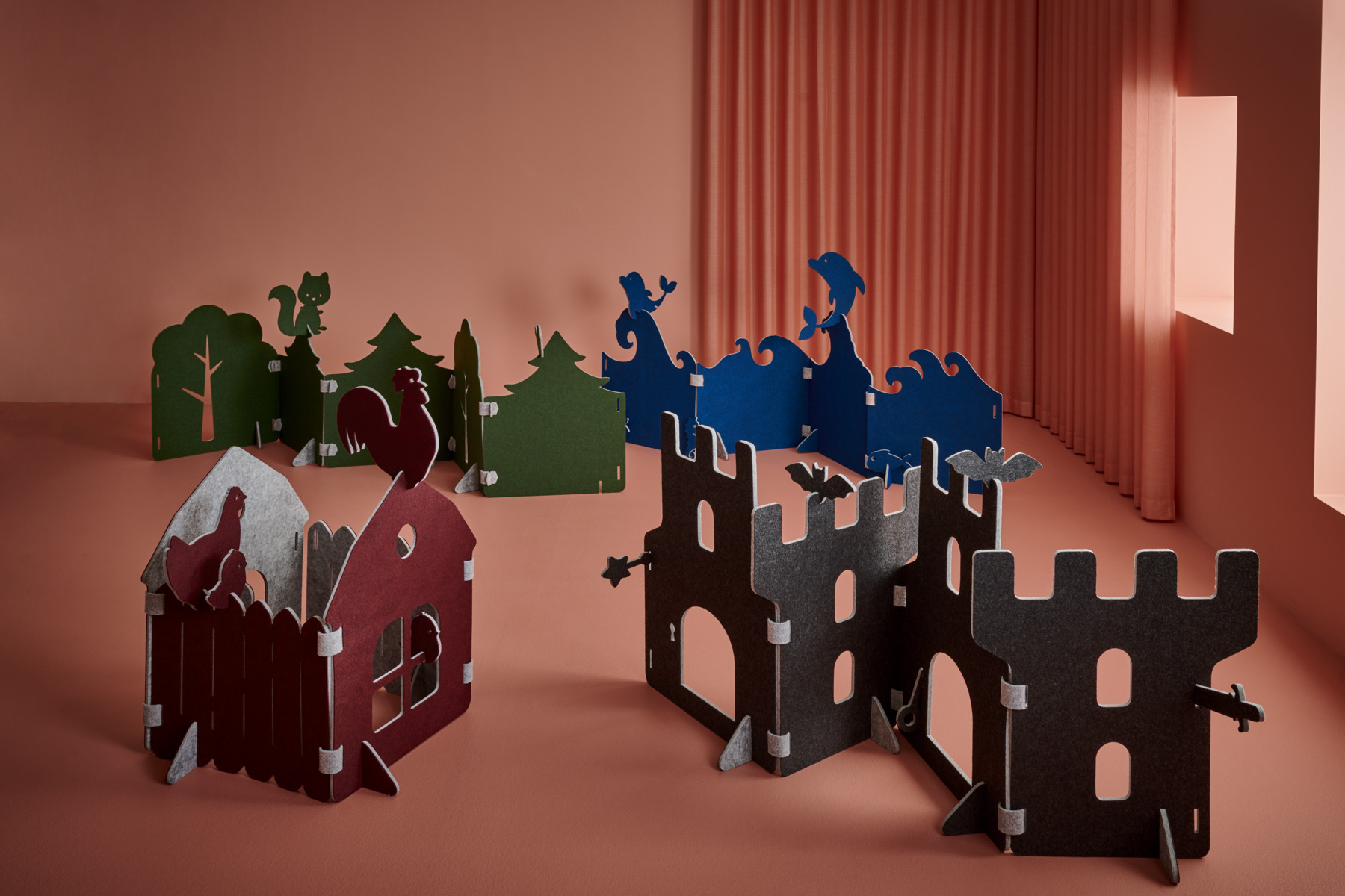 Lekskärmar i ljuddämpande filt. Används till scenografi, som rumsavdelare, krypin eller som förstärkande element i leken. Alla delar i Saga-serien kan användas tillsammans. En kombination av en bondgård med 4 skärmar, 4 fötter och 6 gångjärn. Här ingår också en tupp, en höna och tre kycklingar vilka kan monteras på lekskärmarna. Skärmarna är tvåfärgade, ena sidan är alltid ljusgrå. Fötter följer samma färgkombination som val av färg. Gångjärn är ljusgrå. Mått på skärmar: B58xH70 cm. Minst 50 % återvunnet material. 100 % återvinningsbar.