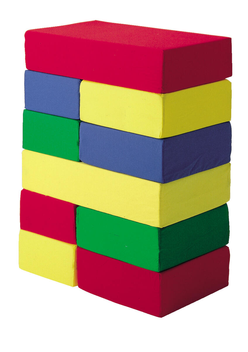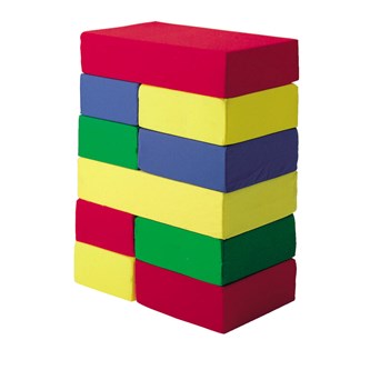 Kallskum. Klädd med avtagbart bomullstyg i blandade färger. 14 st byggklossar: 2 st 40x40x20 cm, 4 st 40x20x20 cm, 2 st 20x20x20 cm, 2 st cirkel diam. 40x20 cm, 2 st cylinder diam. 20x40 cm, 2 st triangel 40x40x56/20 cm. Oeko-Tex.