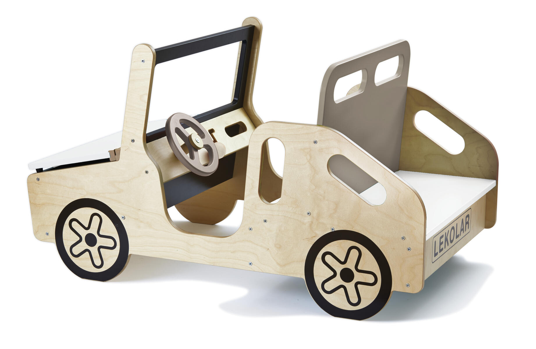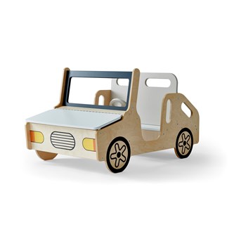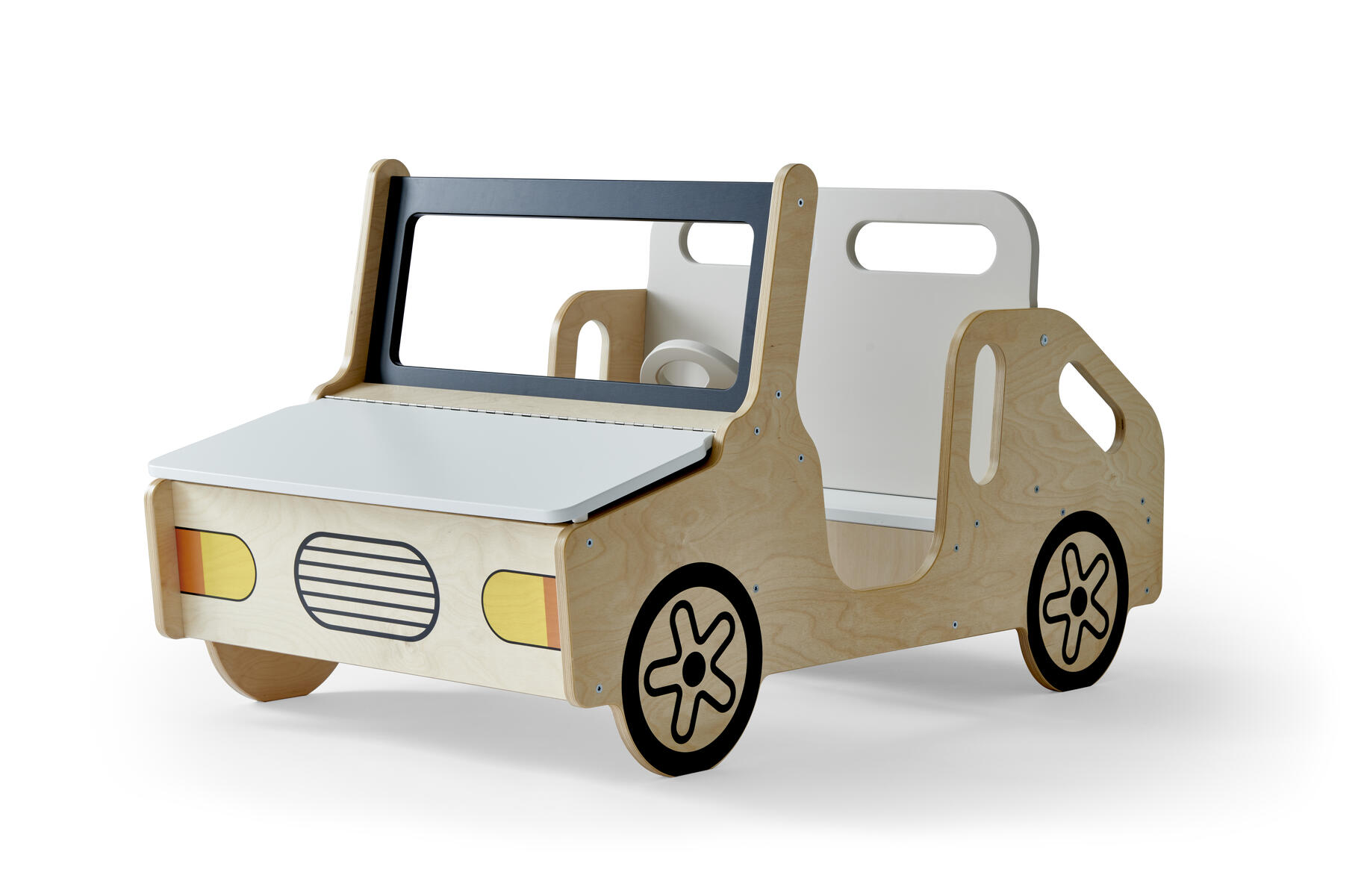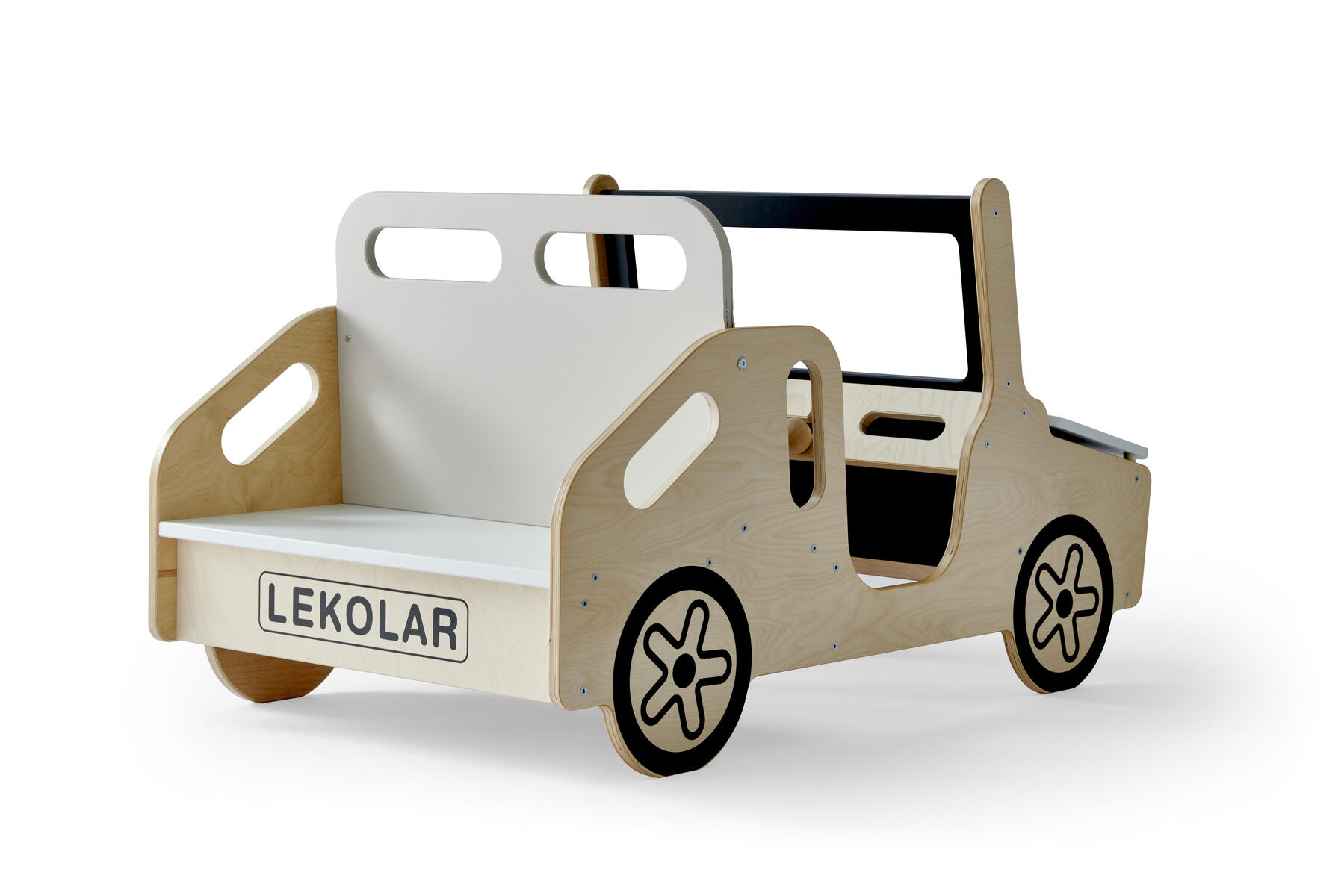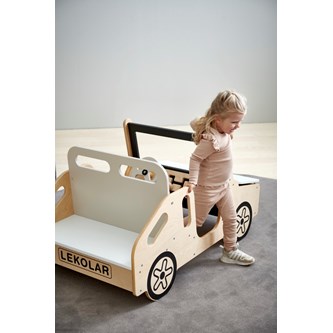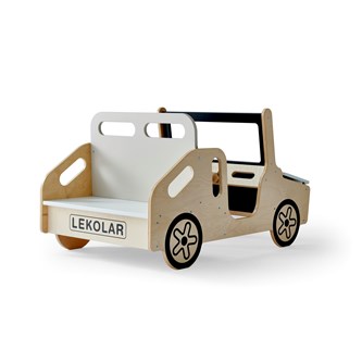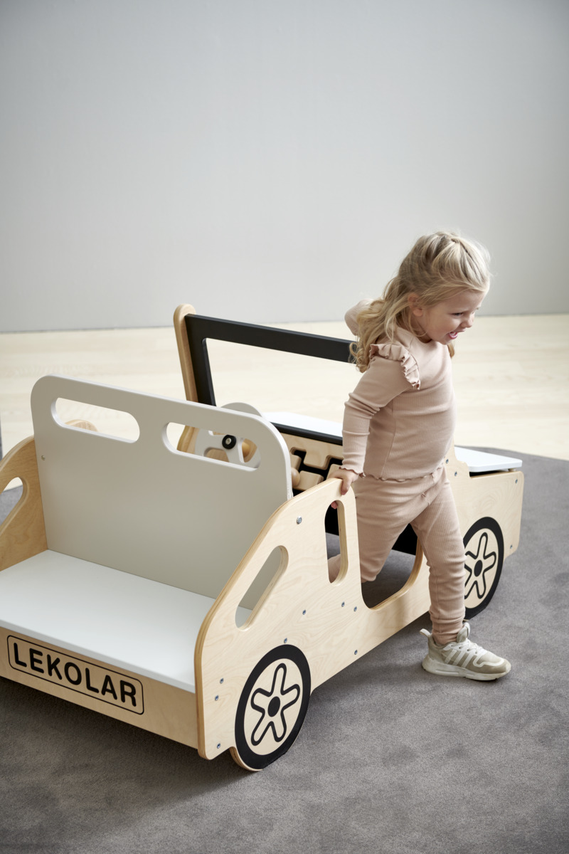 En tuff och rolig lekbil med plats för 4 barn. Man kan klättra in i bilen, köra, använda de rörliga instrumenten och ha passagerare där bak. Rörliga detaljer som ratt och växelspak. Öppningsbar lucka fram så att man i rolleken kan packa i och ur. Luckan stängs långsamt med hjälp av gasfjäder. Öppen botten förenklar städning. Lätt att flytta. Av kraftig, lackerad, FSC-godkänd plywood. Levereras omonterad, monteringsanvisningar finns att skriva ut under fliken dokument.