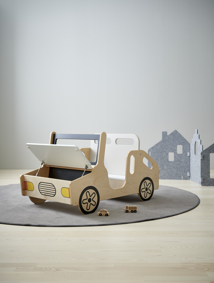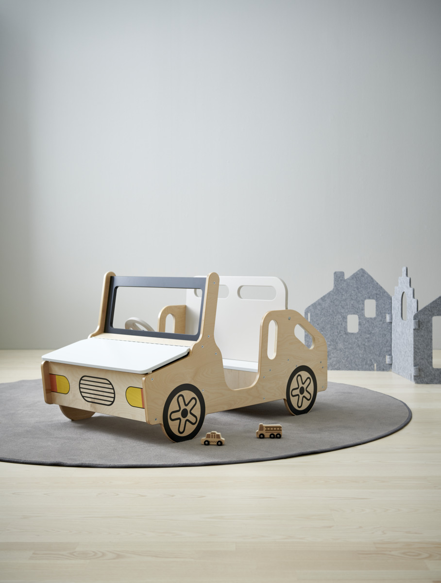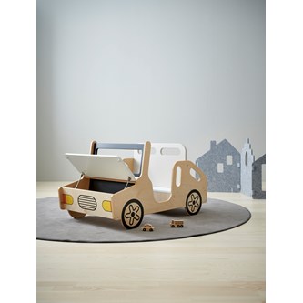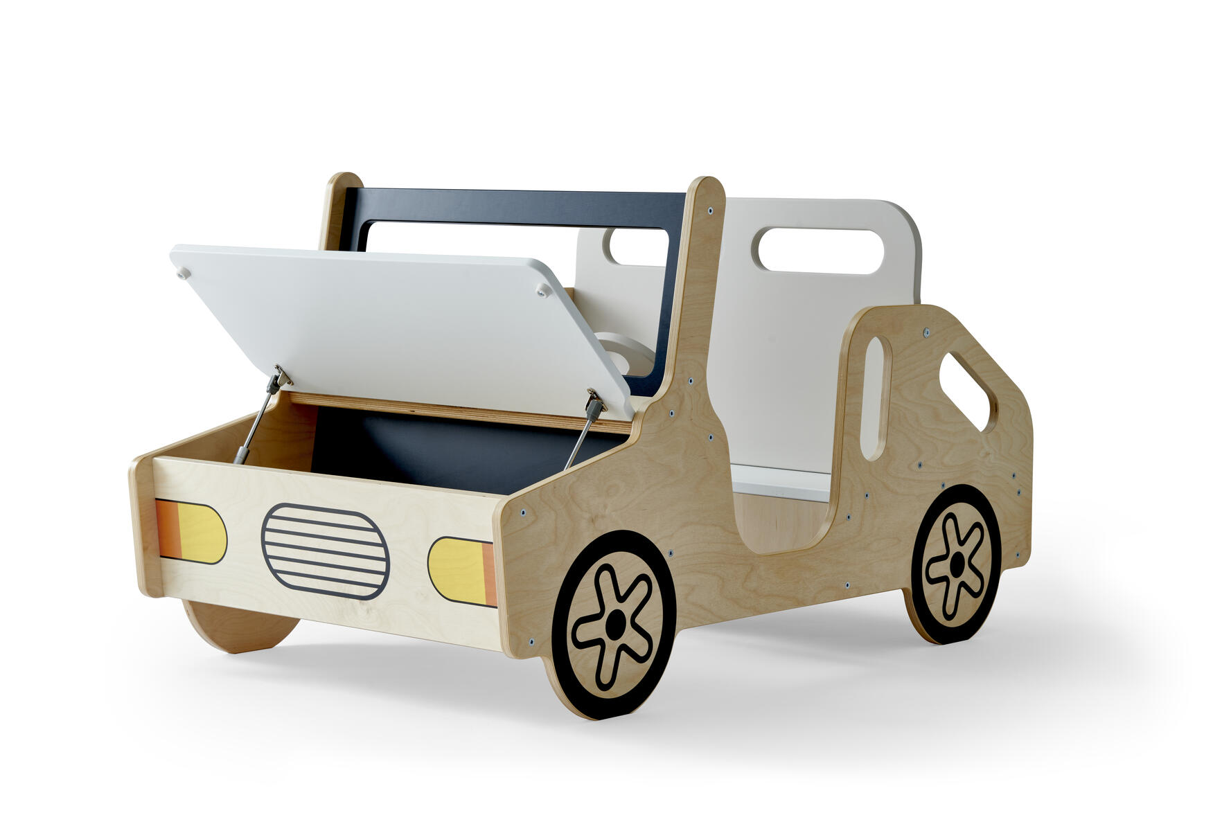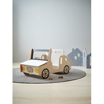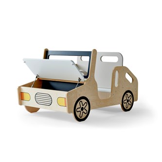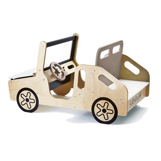 En tuff och rolig lekbil med plats för 4 barn. Man kan klättra in i bilen, köra, använda de rörliga instrumenten och ha passagerare där bak. Rörliga detaljer som ratt och växelspak. Öppningsbar lucka fram så att man i rolleken kan packa i och ur. Luckan stängs långsamt med hjälp av gasfjäder. Öppen botten förenklar städning. Lätt att flytta. Av kraftig, lackerad, FSC-godkänd plywood. Levereras omonterad, monteringsanvisningar finns att skriva ut under fliken dokument.