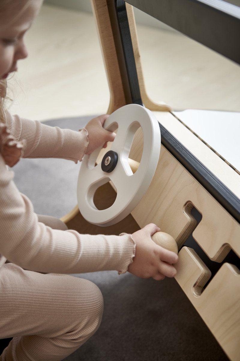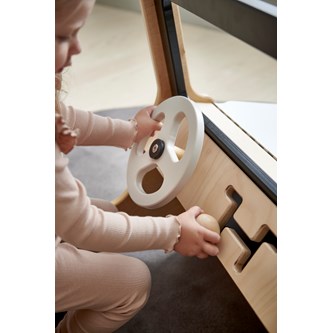 Fordon med lekratt, växelspak och kök – perfekt för att leka affär eller restaurang. Skriv dagens meny på tavlan. Arbetsytan har ett handfat, 2 kokplattor, en mikrovågsugn och gott om förvaringsutrymme. Tillbehör ingår ej. Paneler av björkplywood, endast lämplig för inomhusbruk. Av FSC-märkt trä. Monteringsanvisning medföljer. Mått: L110xB83xH115 cm. Arbetsytans höjd: 59 cm. Från 3 år.
