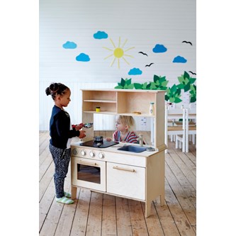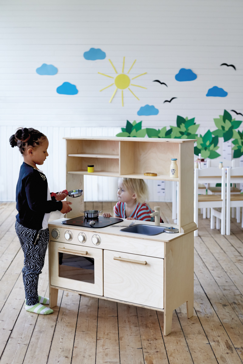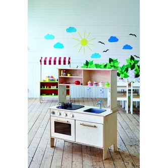 Ett lekkök i plywood som lever upp till förskolans höga krav. Med många olika funktioner som spishäll med 3 plattor, ugn, rörliga vred med tydliga graderingar, öppningsbara luckor och utdragbar plåt, diskho samt bra hyllförvaring i överskåp. Stora ljusa träytor som passar in i många olika miljöer. Höga ben förenklar städning. Av kraftig, lackerad, FSC-godkänd plywood. Diskbalja av PP. Levereras i 2 delar som enkelt skruvas ihop. Ska förankras i vägg. Från 2 år.