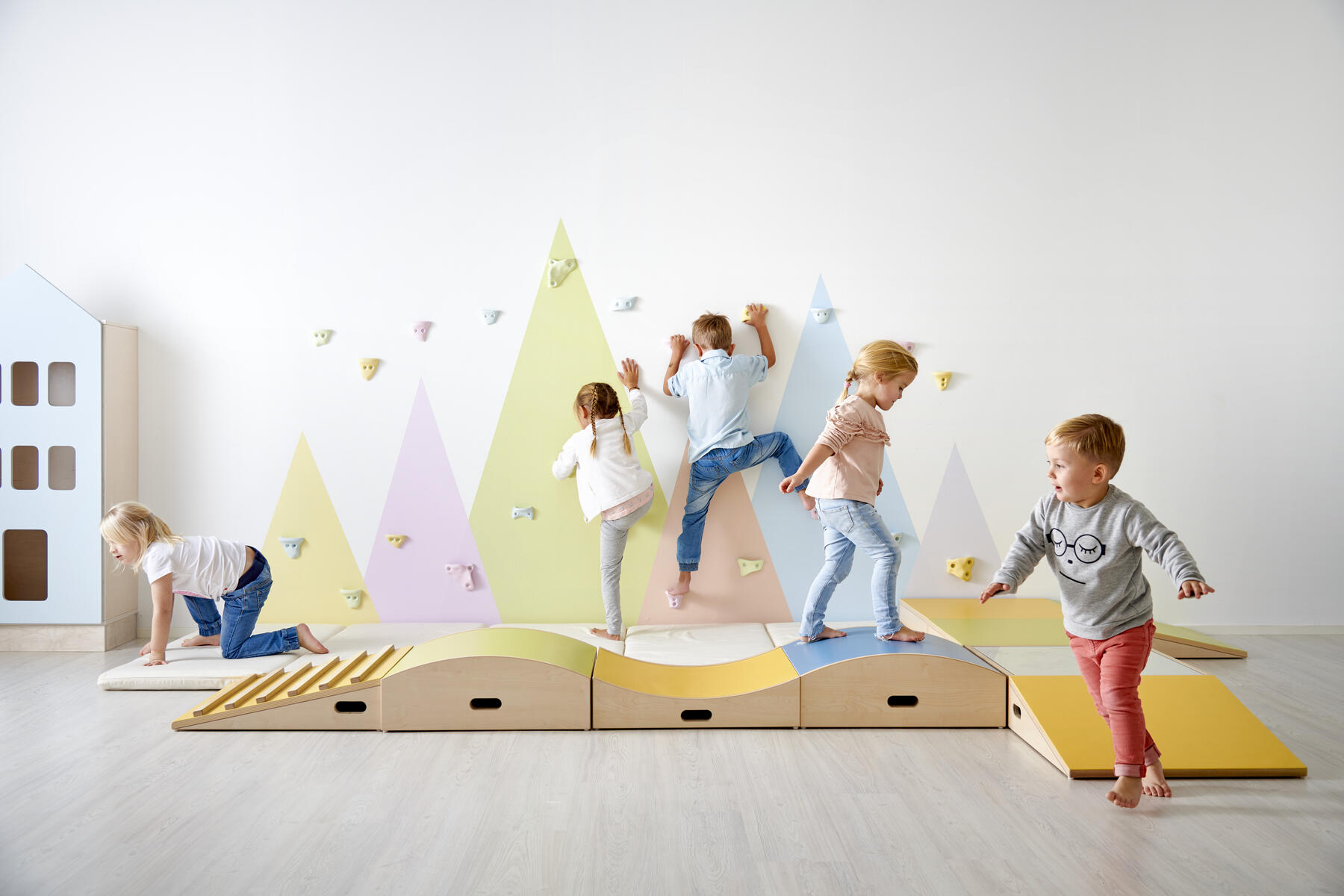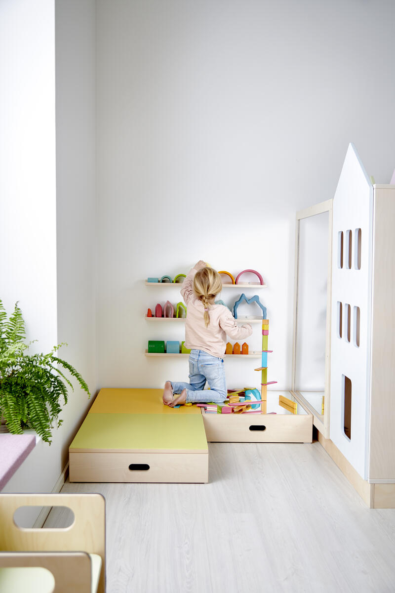 Kan användas som podium eller tunnel för de allra minsta. Den lilla delen och mellandelen skjuts in under den stora för platsbesparing när de inte används. Mått: liten del B46xD46xH23 cm, mellandel B53xD53xH26,5 cm, stor del B60xD60x30 cm. Mix består av vit, ljusgrå och grå HT. Design: Monika Mulder. Svanenmärkt, licensnummer 5031 0099.