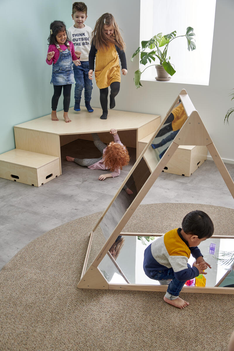 Kan användas som podium eller tunnel för de allra minsta. Den lilla delen och mellandelen skjuts in under den stora för platsbesparing när de inte används. Mått: liten del B46xD46xH23 cm, mellandel B53xD53xH26,5 cm, stor del B60xD60x30 cm. Mix består av vit, ljusgrå och grå HT. Design: Monika Mulder. Svanenmärkt, licensnummer 5031 0099.