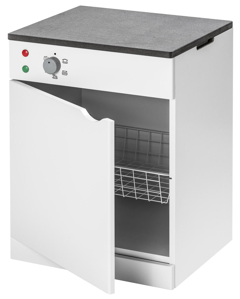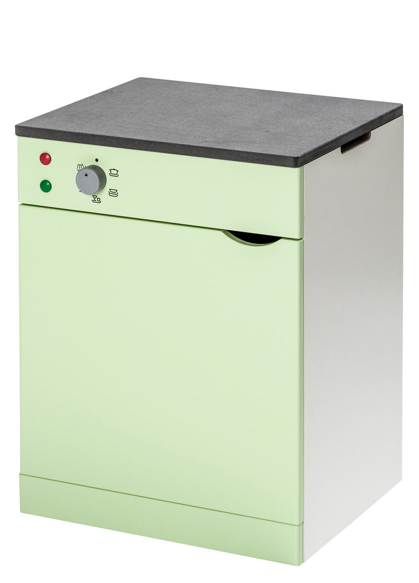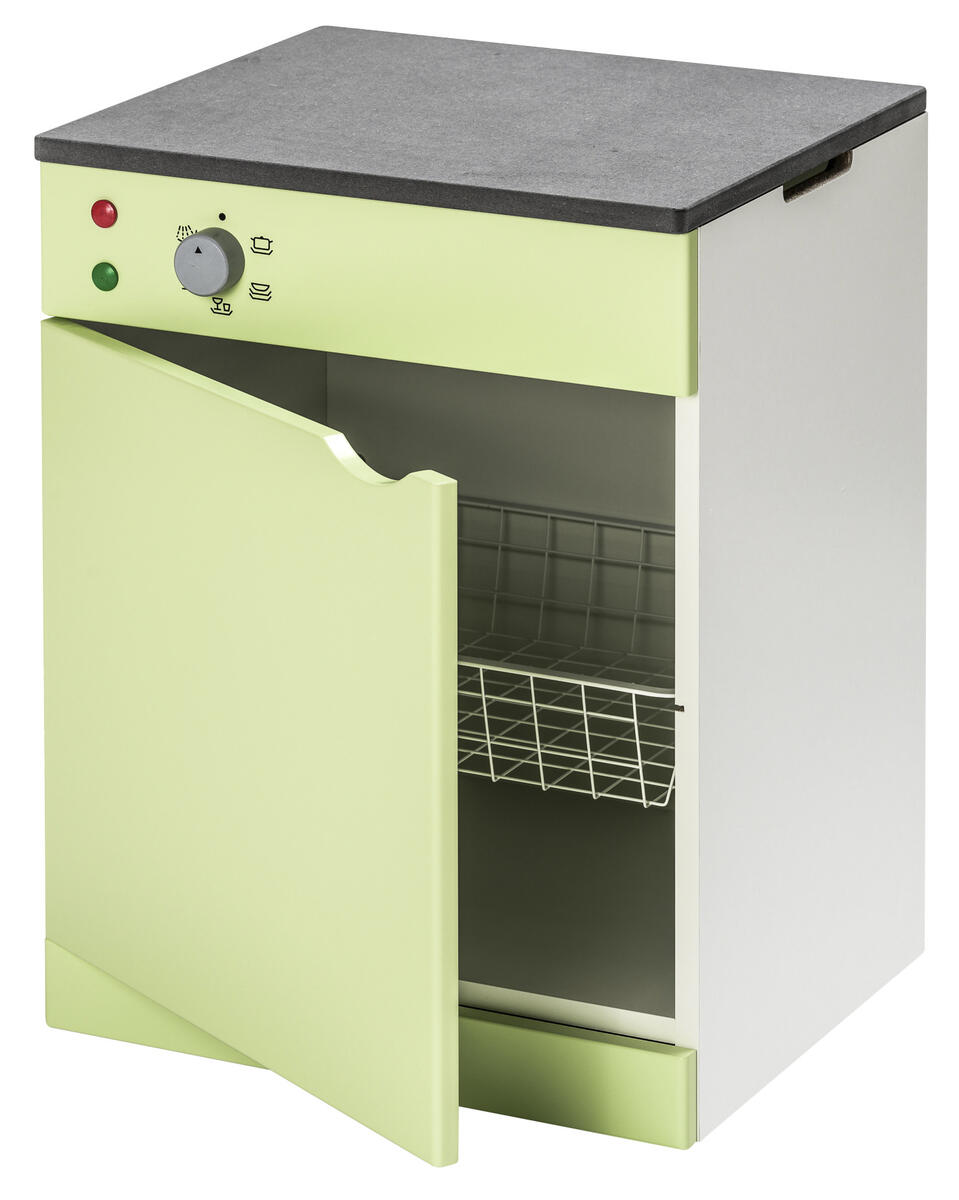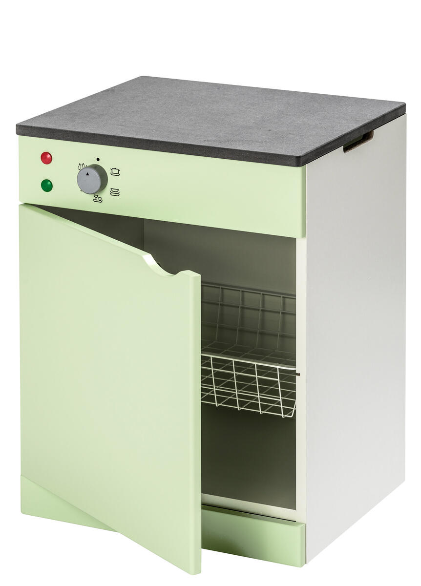 Köksskåp anpassat för förskolemiljö. Sidhängd dörr för optimal säkerhet, med handhål för enkel öppning. Lufthål/handtag på sidorna. Material: lucka, sockel, överdel i MDF och stomme i 16 mm spånskiva. Färger koordinerade till övrigt sortiment. Mått: B45xD39xH59 cm. Lämplig från 3 år. Vikt 16 kg. Levereras omonterad.