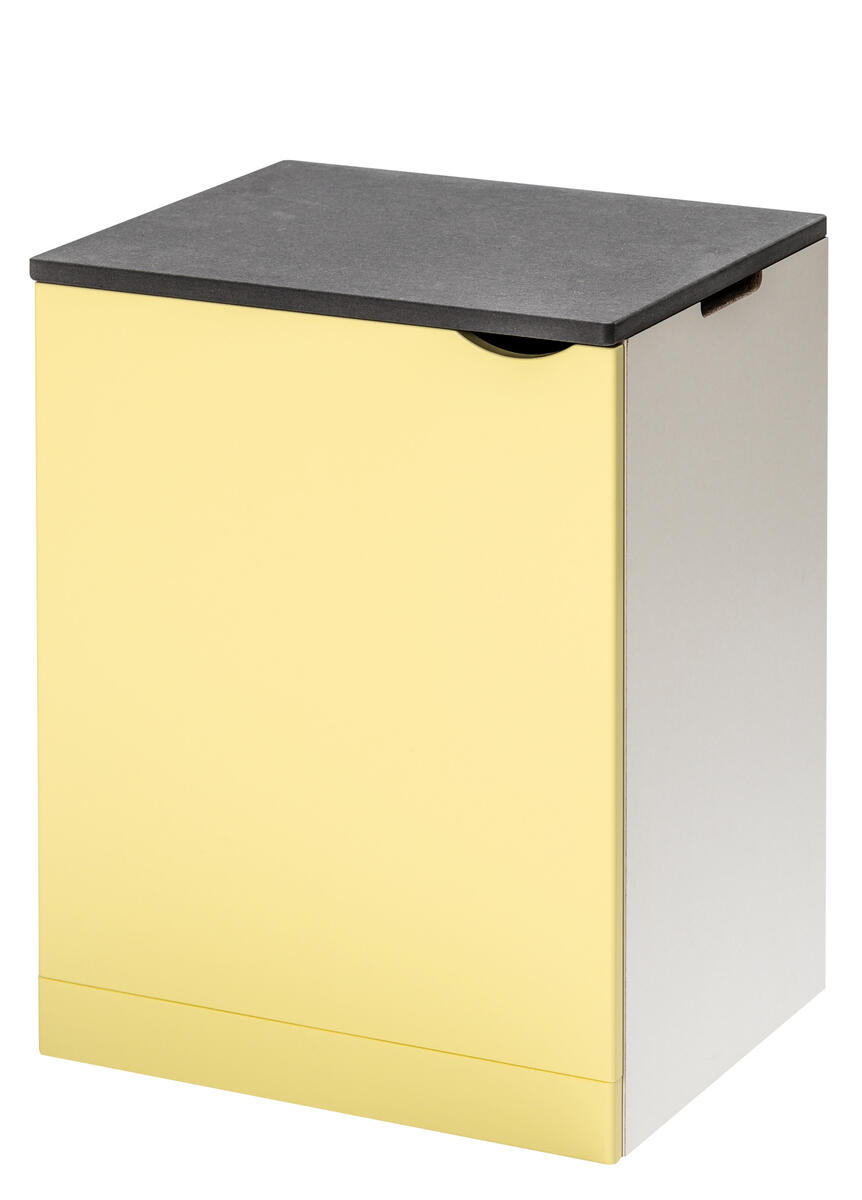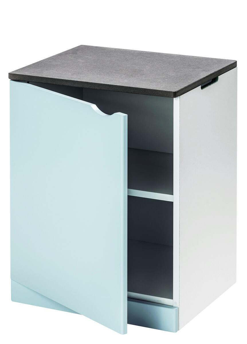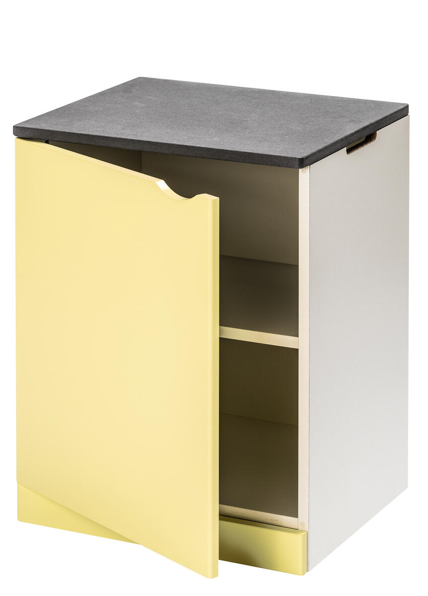 Köksskåp anpassat för förskolemiljö. Sidhängd dörr för optimal säkerhet, med handhål för enkel öppning. Lufthål/handtag på sidorna. Material: lucka, sockel, överdel i MDF och stomme i 16 mm spånskiva. Färger koordinerade till övrigt sortiment. Mått: B45xD39xH59 cm. Lämplig från 3 år. Vikt 16 kg. Levereras omonterad.