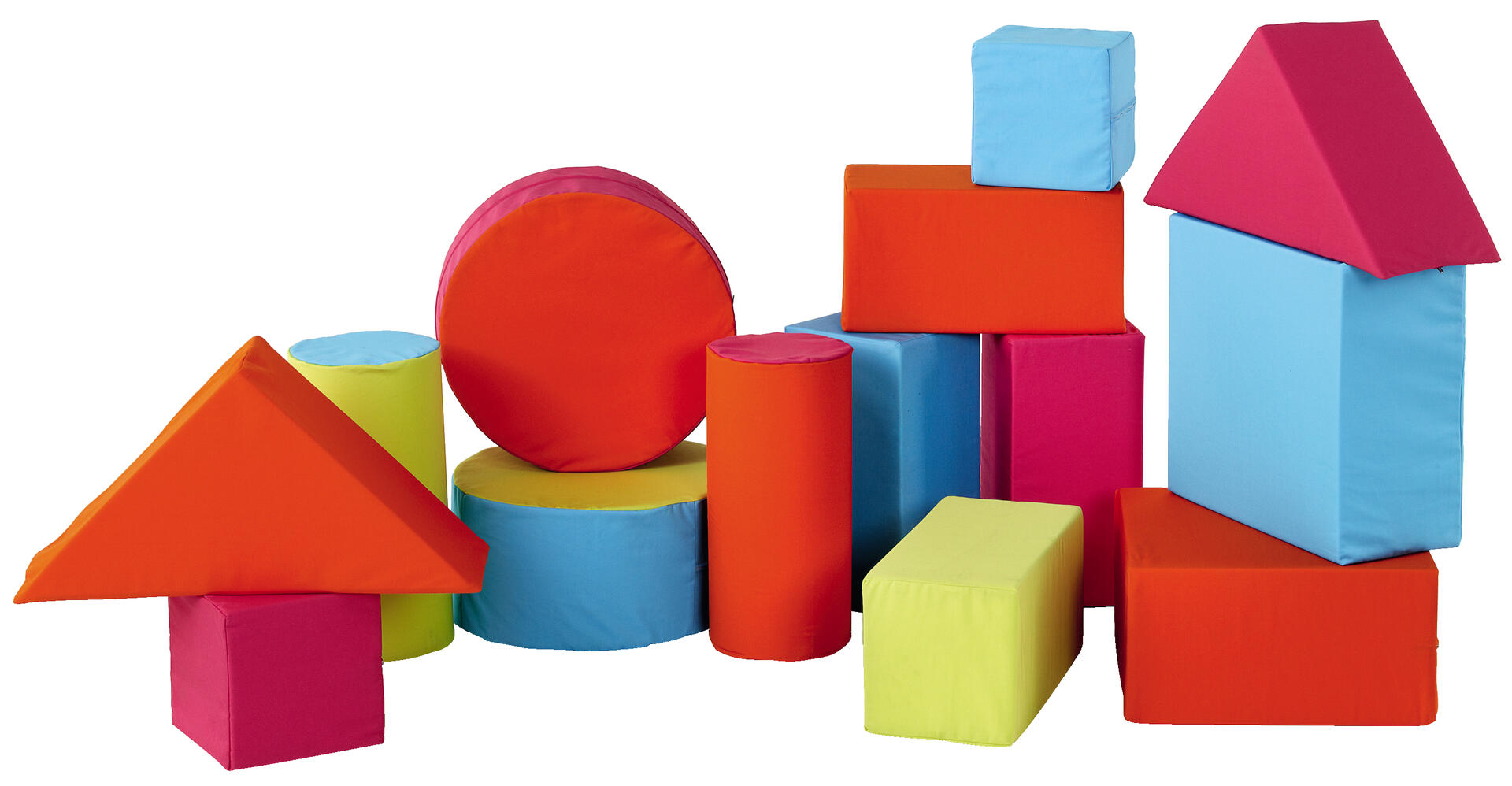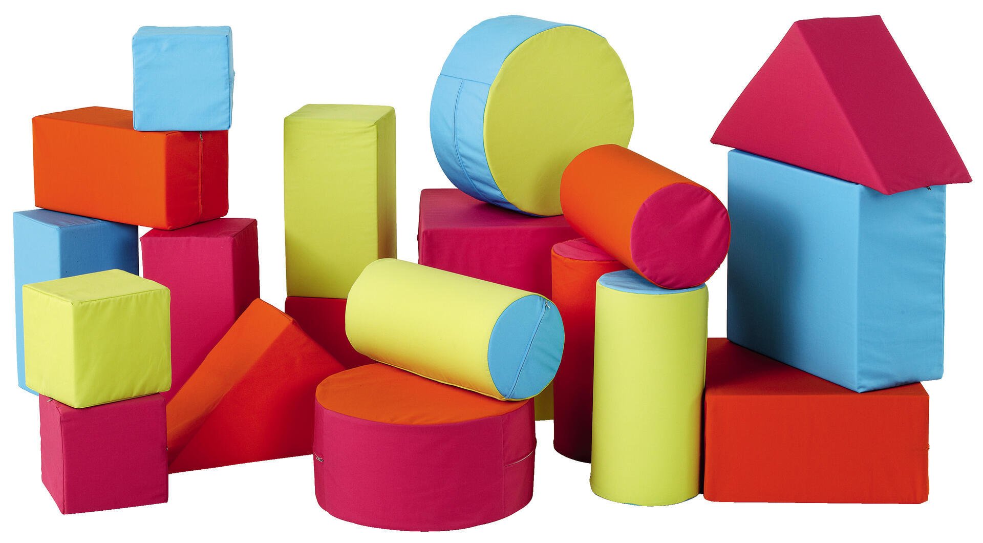 Kallskum. Klädd med avtagbart bomullstyg i blandade färger. 14 st byggklossar: 2 st 40x40x20 cm, 4 st 40x20x20 cm, 2 st 20x20x20 cm, 2 st cirkel diam. 40x20 cm, 2 st cylinder diam. 20x40 cm, 2 st triangel 40x40x56/20 cm. Oeko-Tex.