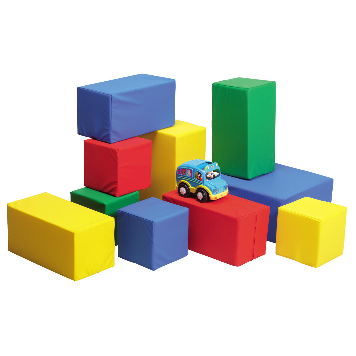 Kallskum. Klädd med avtagbart bomullstyg i blandade färger. 14 st byggklossar: 2 st 40x40x20 cm, 4 st 40x20x20 cm, 2 st 20x20x20 cm, 2 st cirkel diam. 40x20 cm, 2 st cylinder diam. 20x40 cm, 2 st triangel 40x40x56/20 cm. Oeko-Tex.