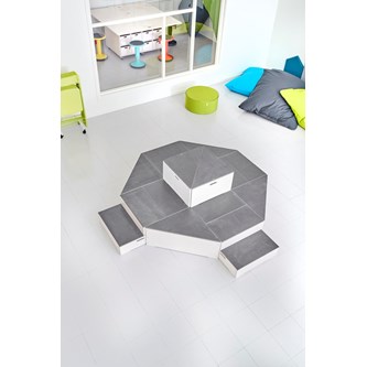 Kan användas som podium eller tunnel för de allra minsta. Den lilla delen och mellandelen skjuts in under den stora för platsbesparing när de inte används. Mått: liten del B46xD46xH23 cm, mellandel B53xD53xH26,5 cm, stor del B60xD60x30 cm. Mix består av vit, ljusgrå och grå HT. Design: Monika Mulder. Svanenmärkt, licensnummer 5031 0099.