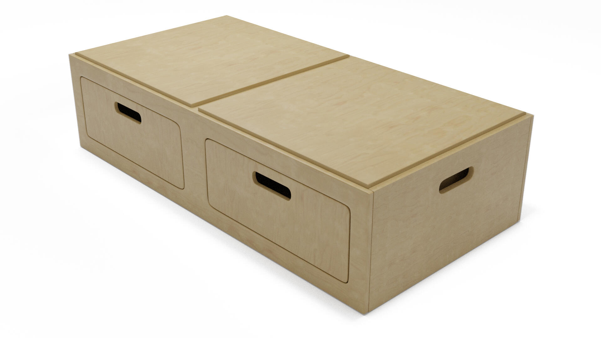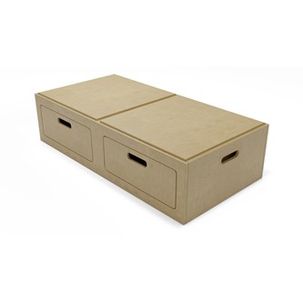 Scenmoduler med räfflad yta i fenolfilm för bättre grepp och halkskydd. Med urfrästa handtag. Mått: 60x60x30 cm. Vitpigmenterat björkkryssfaner med grå topp.