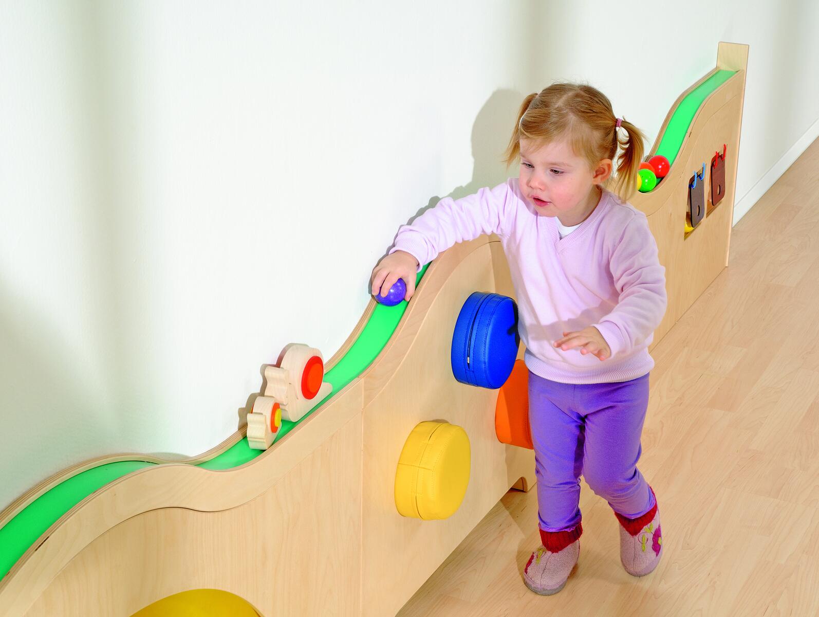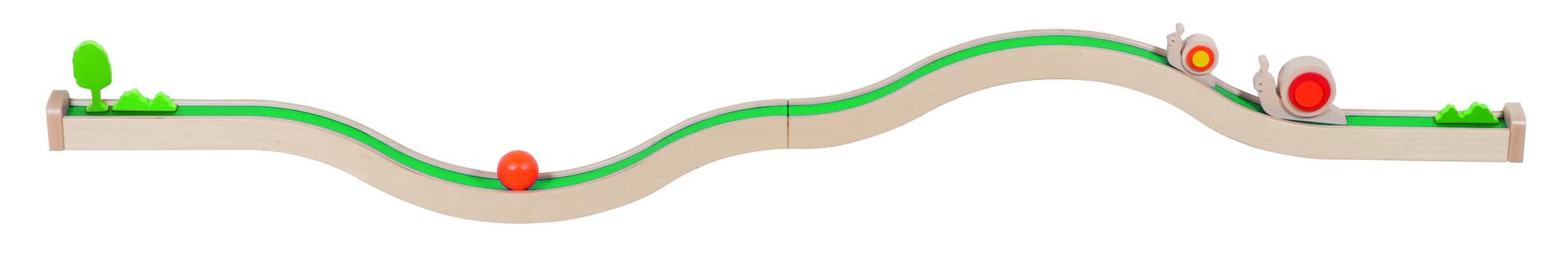 En väggbana som inbjuder barnen till lek. Tillbehören som snigelfamiljen och kulsatsen kan "köra" på vägen – dalarna och bergen påverkar kanske farten? Utvecklar finmotorik samt öga–handkoordination. Björk. Mått: 132,2x5 cm samt ändstycken 2 cm. Innehåller: 1 längd och 2 ändstycken. Från 2 år.