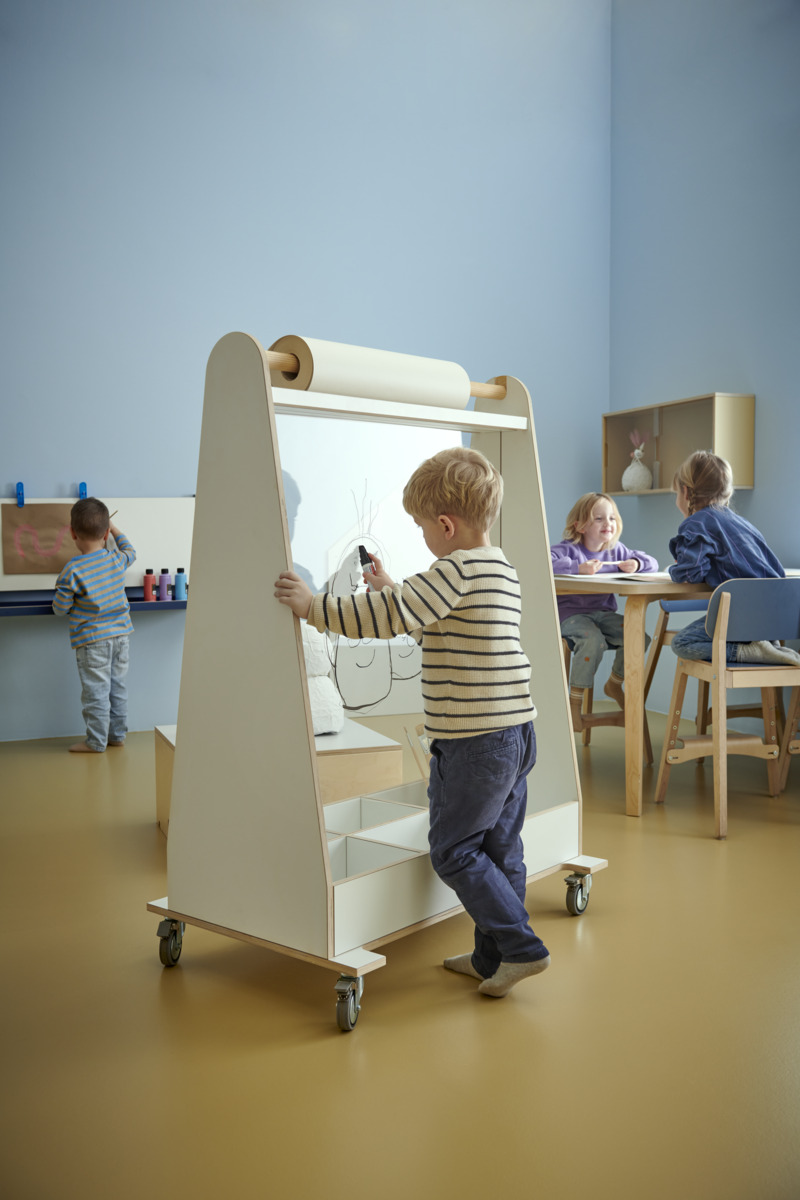 Staffli med små förvaringsfack. Färdig modul i 16 mm björkplywood. Färger med HT är med högtryckslaminat. Björk och vitpigmenterad är helt i 18 mm plywood. Detta är den stora av de två staffli vi erbjuder i vår serie Fixa play. Pappershållare upptill med en plexiruta som avdelar staffliet och gör så att den kan användas på båda sidor. Hjul med lås kräver montering. Mått: B88xD46/60xH127 cm.
