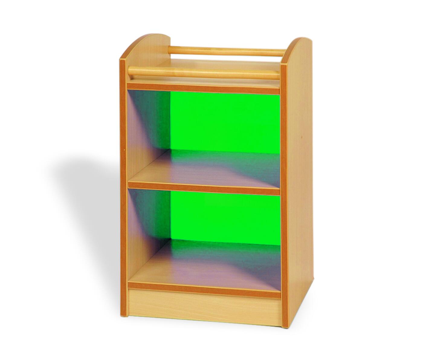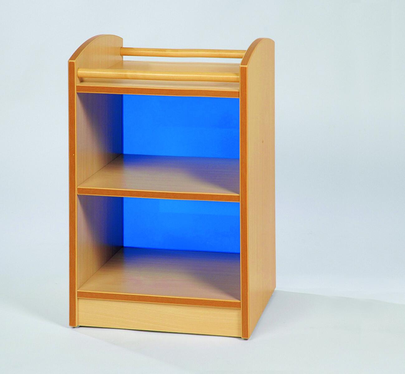 Enkelsidig bokvagn gjord i 18 mm spånskiva med laminat. Kantband i plywoodlook. Fyra hjul varav två är låsbara och rörliga, två fasta. Totalhöjd 80 cm. Höjd framkant hylla 8 cm. Höjd bakkant på de två främre hylla 23 cm. Översta bakkanten är 18 cm. Djup varje hylla 12 cm. Fackmått nederst 14,5 cm hög, bredd 37 cm. 40,5 djup.