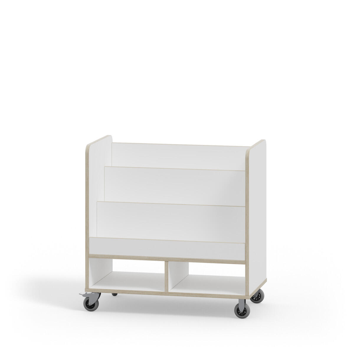Enkelsidig bokvagn gjord i 18 mm spånskiva med laminat. Kantband i plywoodlook. Fyra hjul varav två är låsbara och rörliga, två fasta. Totalhöjd 80 cm. Höjd framkant hylla 8 cm. Höjd bakkant på de två främre hylla 23 cm. Översta bakkanten är 18 cm. Djup varje hylla 12 cm. Fackmått nederst 14,5 cm hög, bredd 37 cm. 40,5 djup.