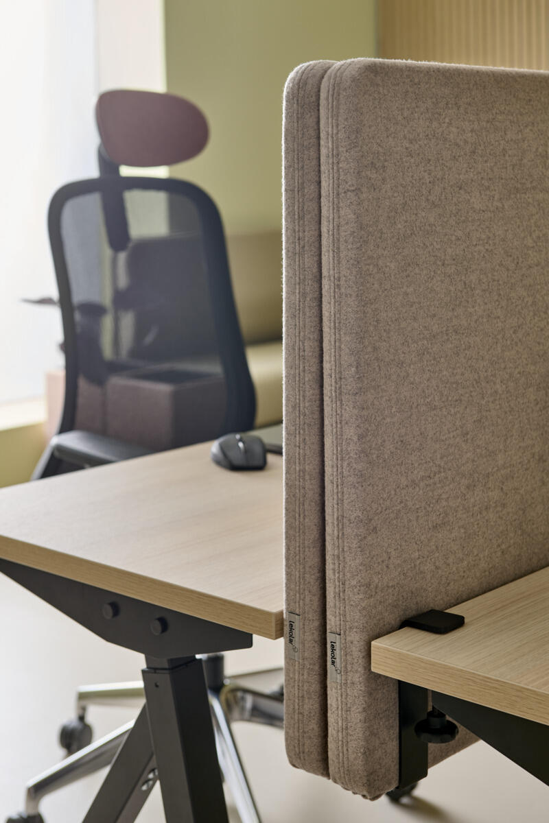 Bordsskärm med ram av massivt trä och en 4 cm tjock ljudabsorberande kärna. Ett utmärkt val för att skapa en mer privat och tyst arbetsplats. Alla fyra hörn är avrundade. Avstånd från bordsyta till skärmens överkant: 50 cm. Beslag för montering beställs separat på artnr 118842.
