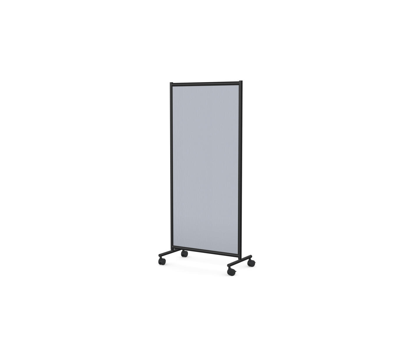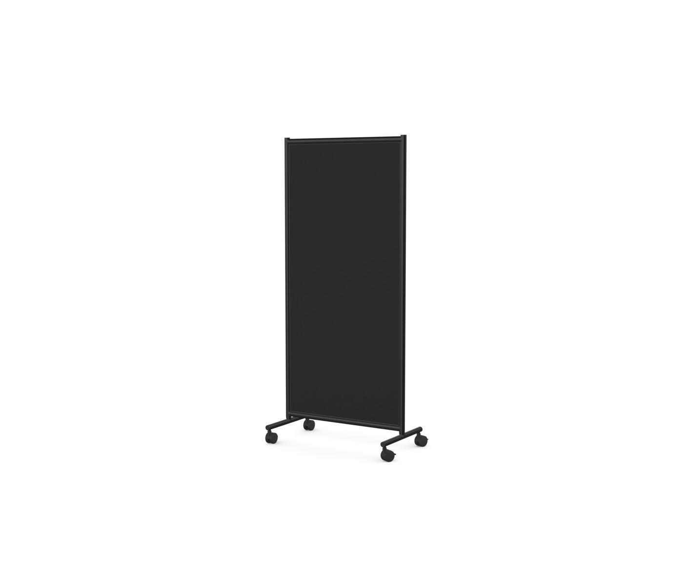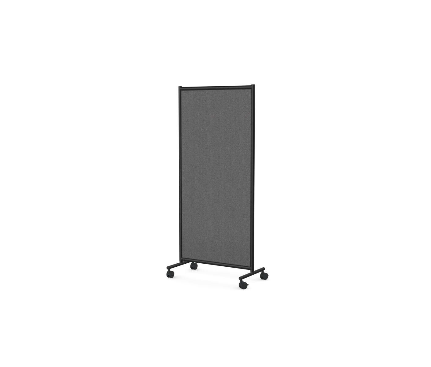 Tredelad skärmvägg i aluminiumram på hjul. Fungerar bra som avdelare för rum-i-rummet. Klädd fiberplatta för möjlig anslagsyta. Mörkgrå. Ett låsbart hjul per hjulpar. Mått: B228xH170 cm.
