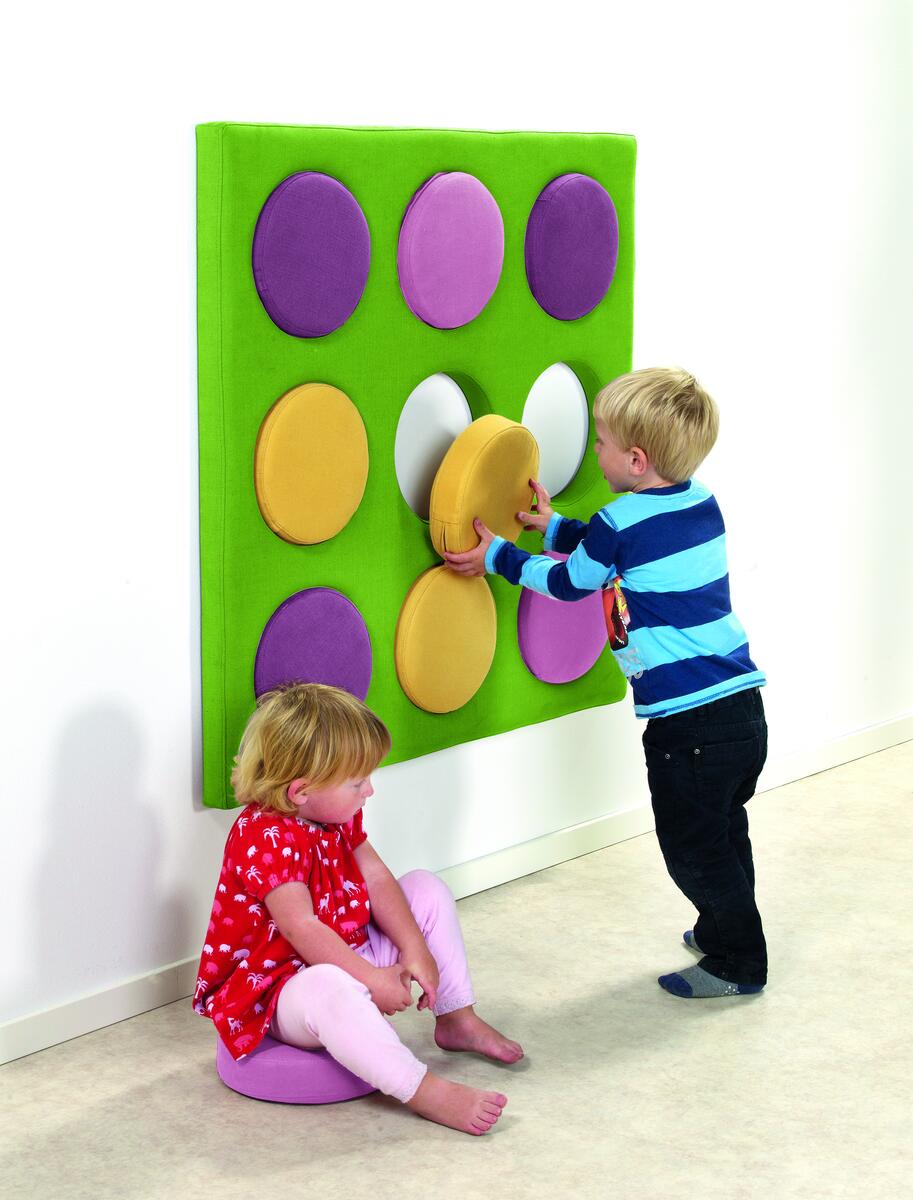 3 i rad spel med 9 sittdynor. Hängs på väggen där den även fungerar som ljudabsorbent. Barn kan själva hämta sina sittdynor eller spela 3 i rad. Mått: B100 H100 cm, sittkudde ø 25 cm. Tjocklek 6 cm. Design: Saga Berhin